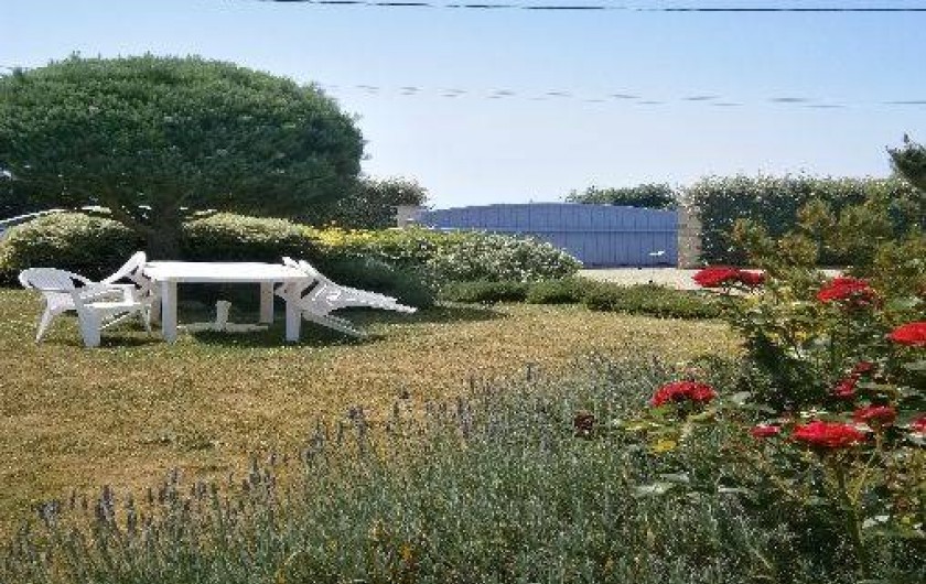 Coin jardin avec salon de jardin et barbecue.