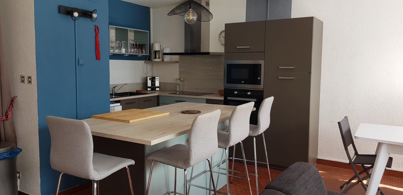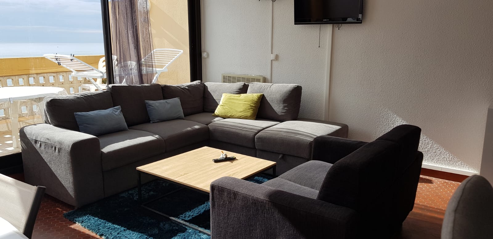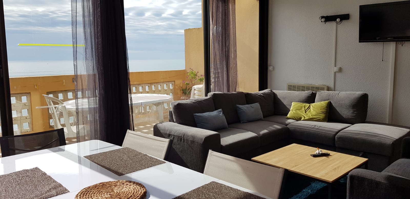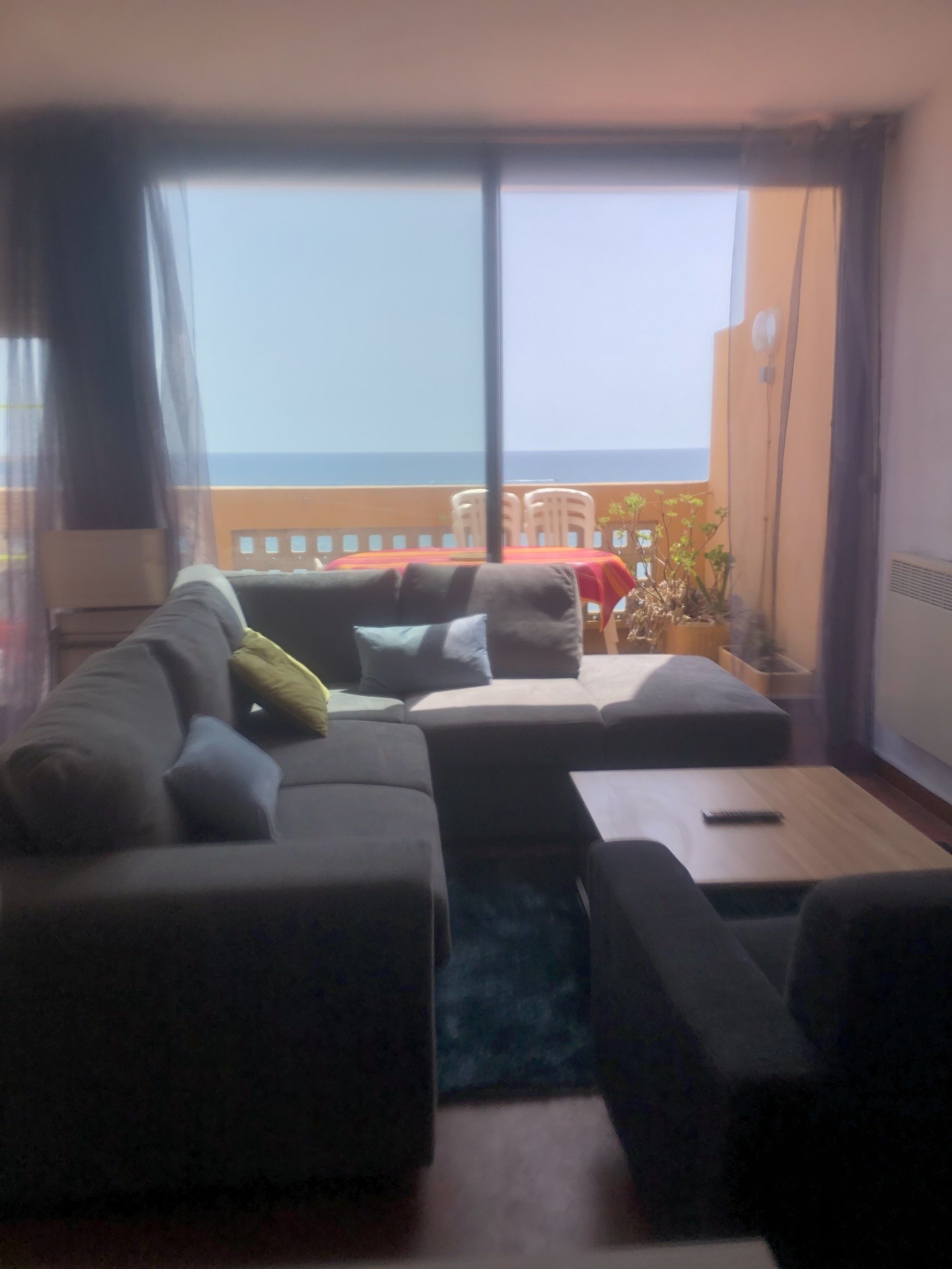Il a été refait à neuf l'an passé il est équipé d'une cuisine ouverte sur une grande pièce avec un îlot centrale. Un magnifique canape d angle face à la mer vous permettra de vous relaxer ! Une terrasse avec table et 6 chaises vous permettra de manger face à la plage.