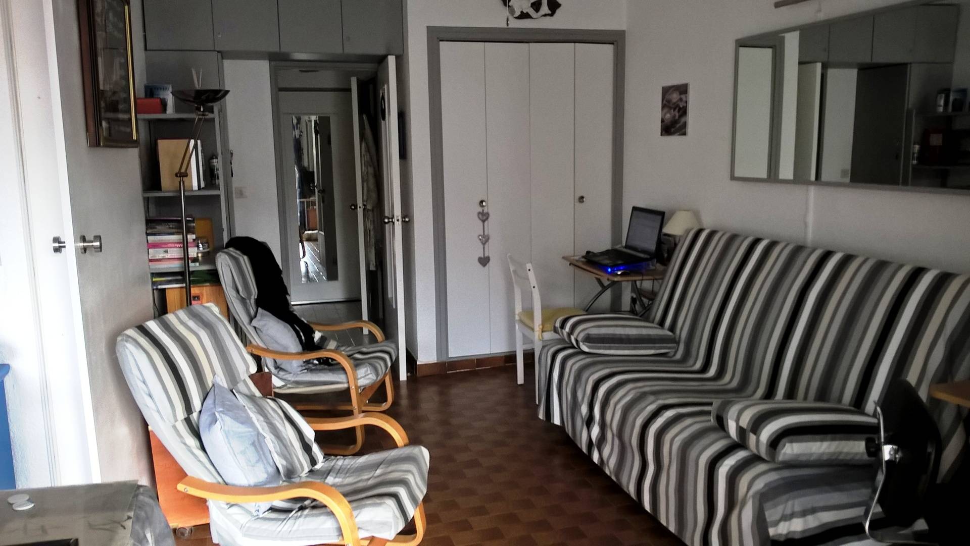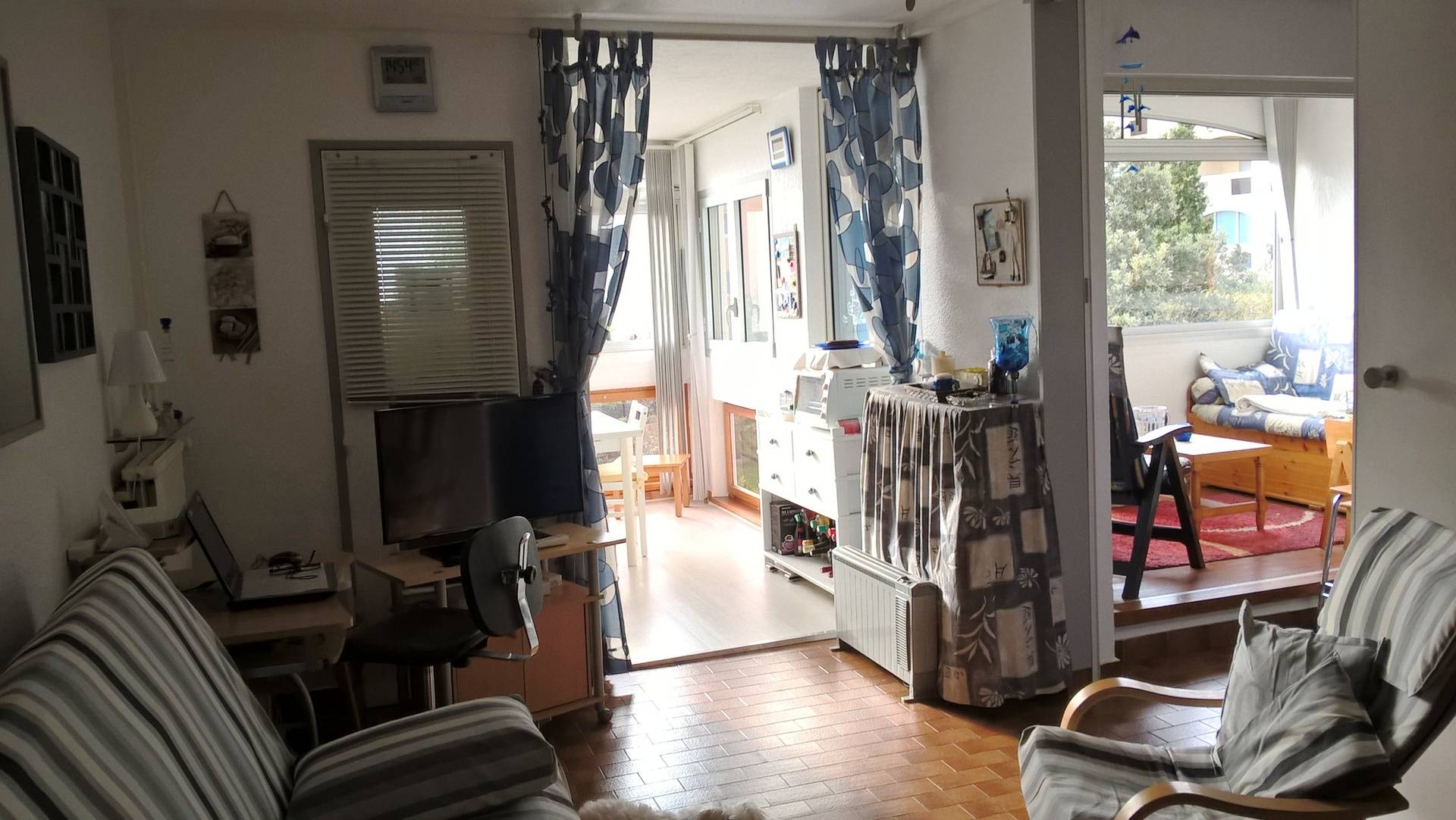 Vous passez une porte, on entre dans le living où il y a un placard de rangement, un divan-lit clic-clac pour 2 personnes, un lit pliable, 2 fauteuils, TV, Vidéo, chaîne radio/CD/cassettes, étagère, table basse –