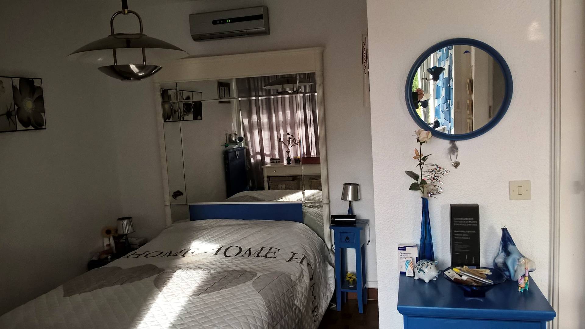 Derrière la loggia, donc à côté du living, il y a la chambre à coucher spacieuse, avec grand placard, lit de 2 personnes, tables de nuit, commode et également un ventilateur.