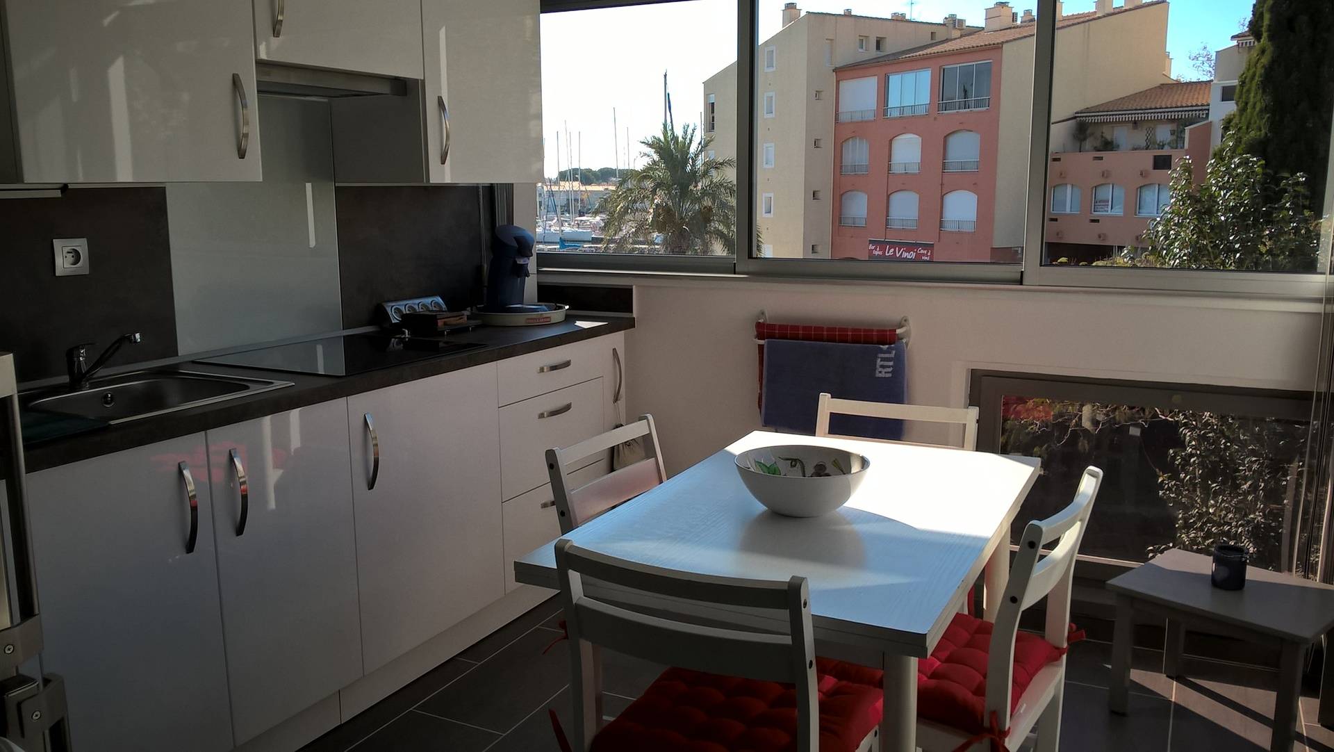 Vous passez une arcade pour entrer dans la cuisine où il y a 1 frigo/congélateur, évier, plaques de cuisson, four MO et four normal, table à rallonges, chaises. Elle est bien équipée en vaisselle, couverts, batterie de cuisine. Vue sur le port de plaisance avec ouverture de 3 fenêtres à glissières (2 qui glissent sur une seule).