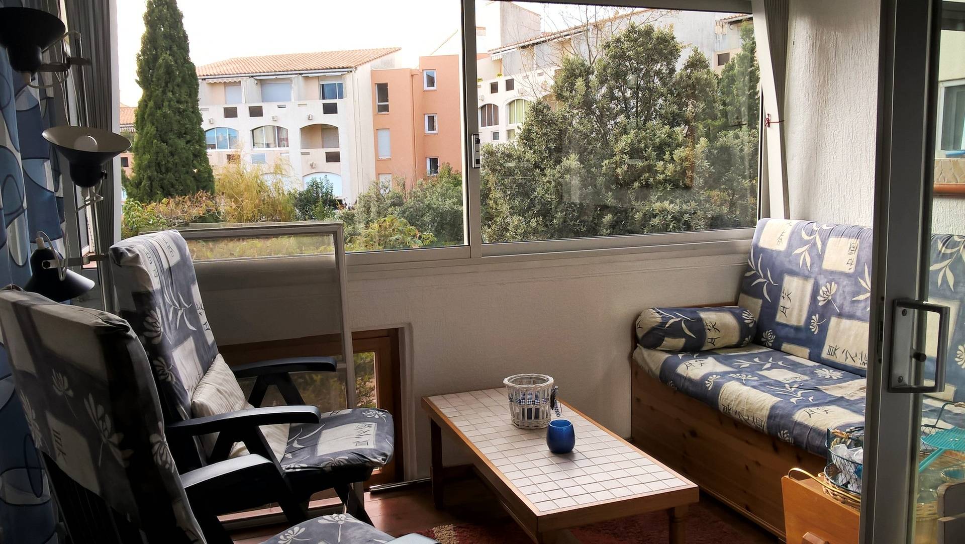A côté de la cuisine, donnant également vue sur le port et sur le parc St-Martin, il y a une loggia dans laquelle il y a un divan (lit d’une personne), 2 fauteuils et une table.