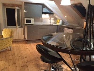 Au troisième étage, en soupente aménagée " Plein ciel" . Expositions Nord/SUD/OUEST . Commerces tout près au pied de l'immeuble. Pièce à vivre avec cuisine ouverte. Deux chambres avec chacune salle d'eau et WC.