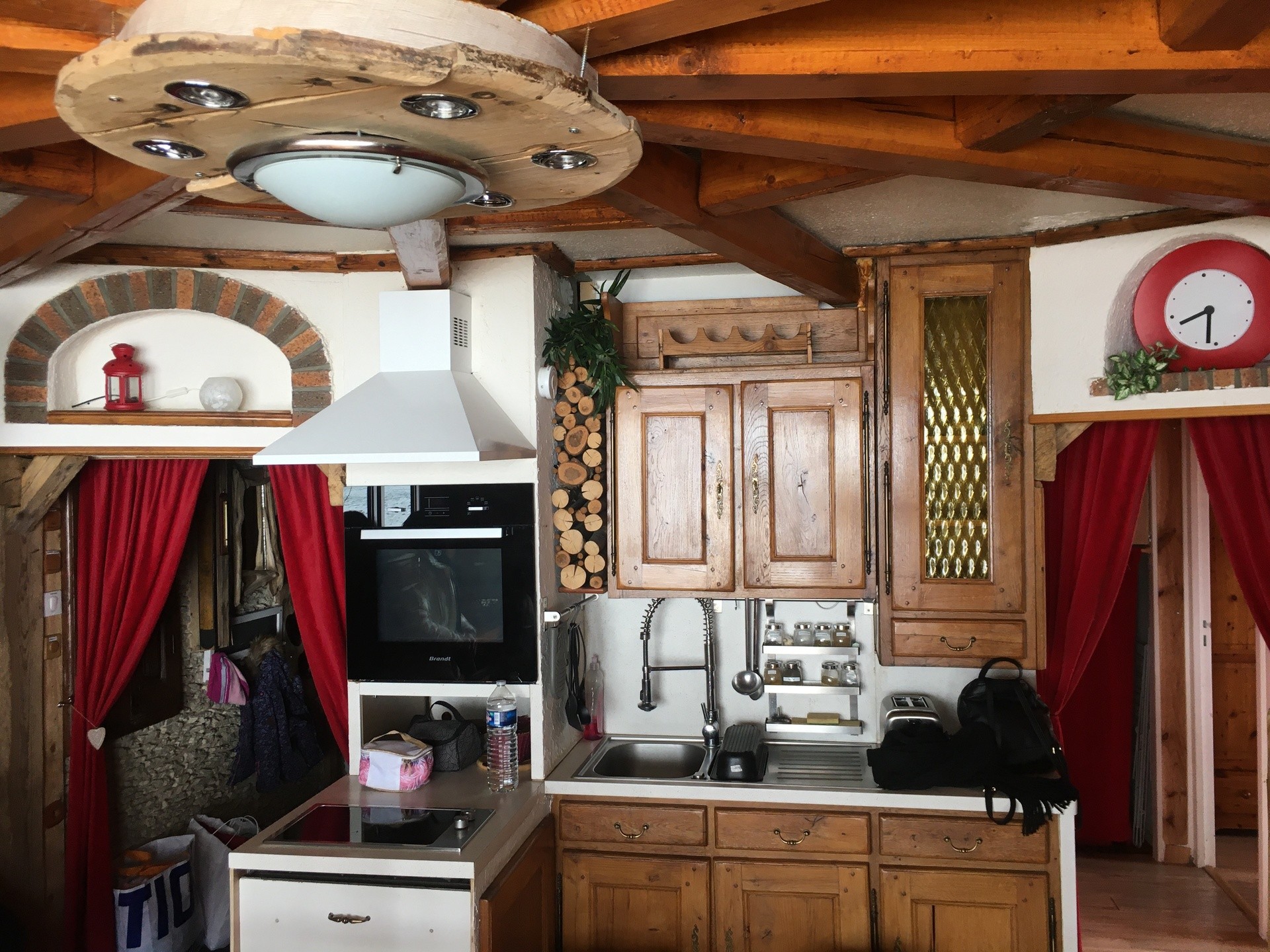 - 1 pièce principale « ambiance chalet » avec décoration bois / pierre, avec 1 canapé-lit 2 places, 1 table avec chaises et tabourets pour accueillir 7 personnes, TV grand écran plat. 1 armoire avec toute la vaisselle nécessaire et appareil à raclette et pierrade.