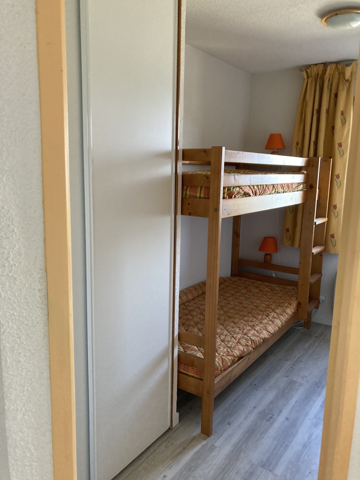 - Une chambre avec fenêtre, comprenant 2 lits superposés et un placard de rangement avec penderie.