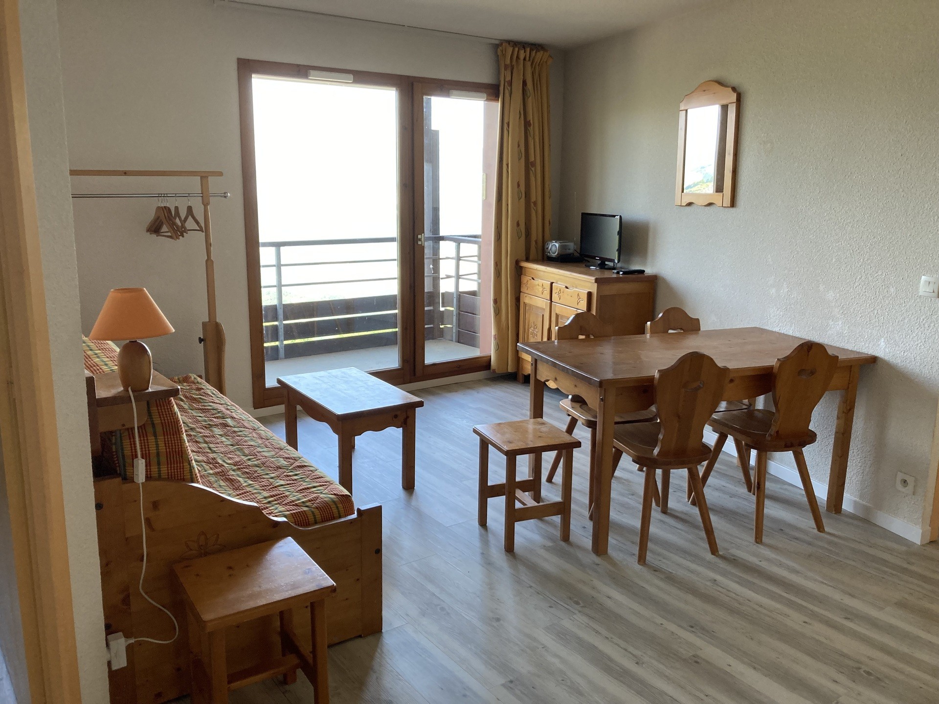 d’un mobilier en pin massif, d’un téléviseur écran plat, et d’un canapé convertible en 2 lits gigognes.