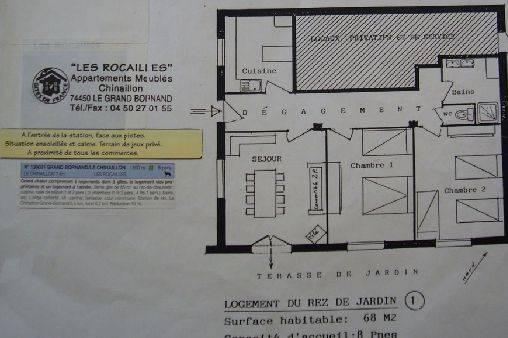 Sur la route du col de la Colombière, grande maison comprenant 3 gîtes et 2 logements des propriétaires. 4ème gîte de 66 m2 au RC : cuisine, salle de séjour (lit gigogne), 2 chambres (1 lit 160 cm, 3 lits 1 pers.). Bains, wc. Draps fournis. Lave-linge commun. Chauffage central, terrasse, cour commune, portique. Espace clos. Séjour 3 semaines -10%. Coeur du village du Chinaillon / Grand-Bornand 0,5 km. Nombreuses activités et animations. Courts séjour sur demande auprès du propriétaires. Tarif Promo été du 23/08 au 30/08/2013 à 590€.