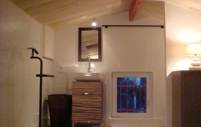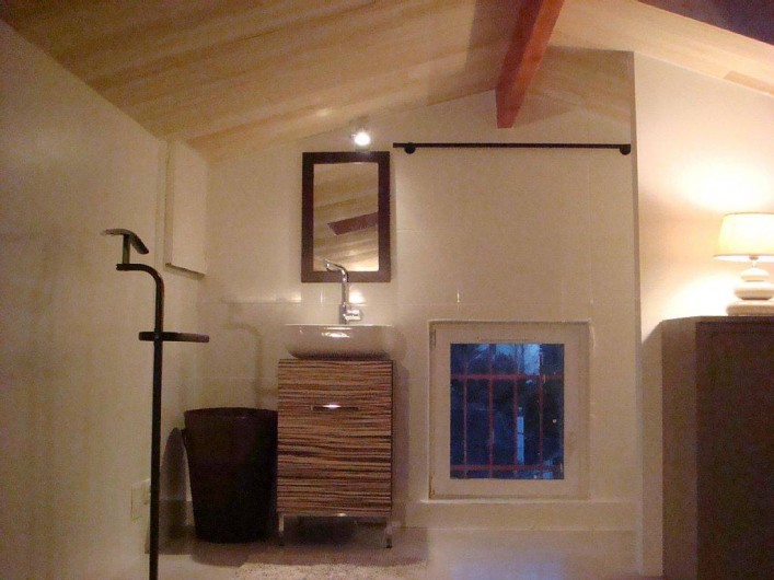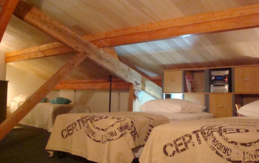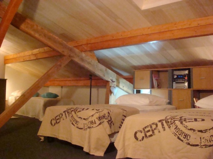 A L'étage grande pièce sous les toits équipée de 3 lits 1 personne + 1 lit bébé pliant, 1 radiateur sèche serviette, 1 lavabo,1 wc, rangements placard et étagères. PARFAITEMENT isolée on ne ressent pas l'excès de chaleur même en cas de canicule