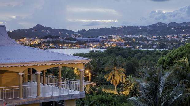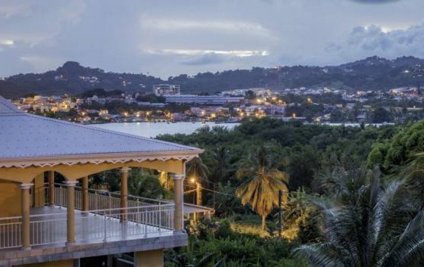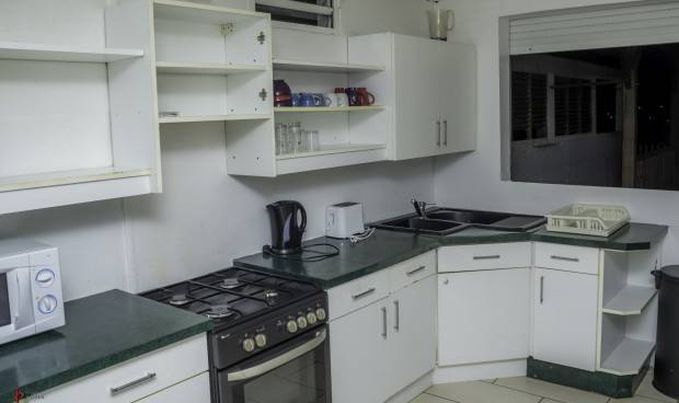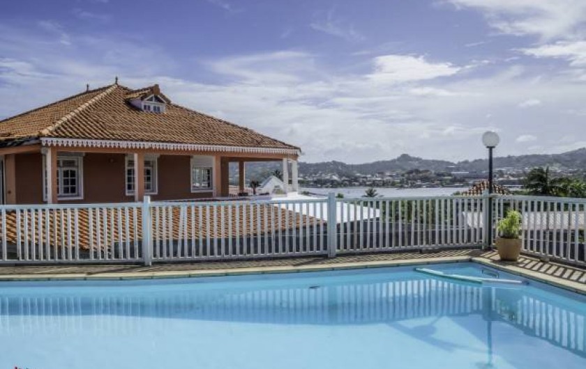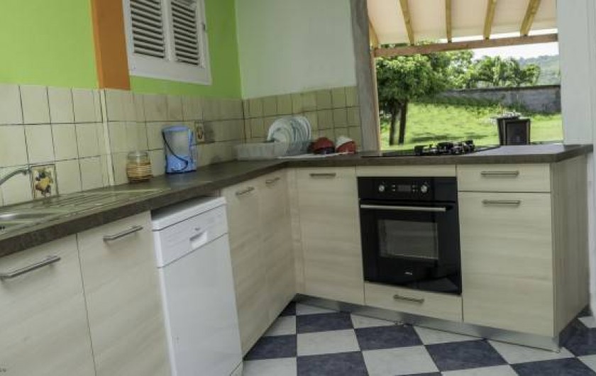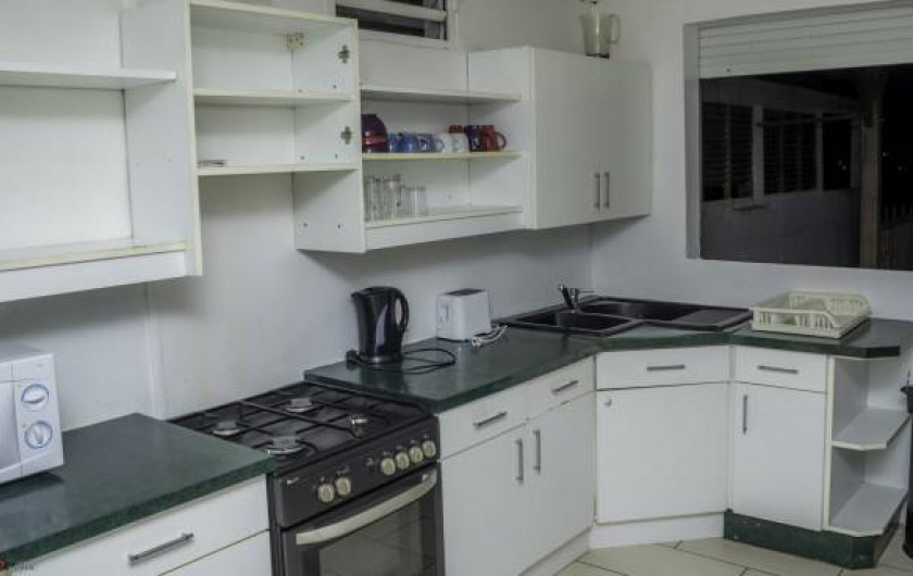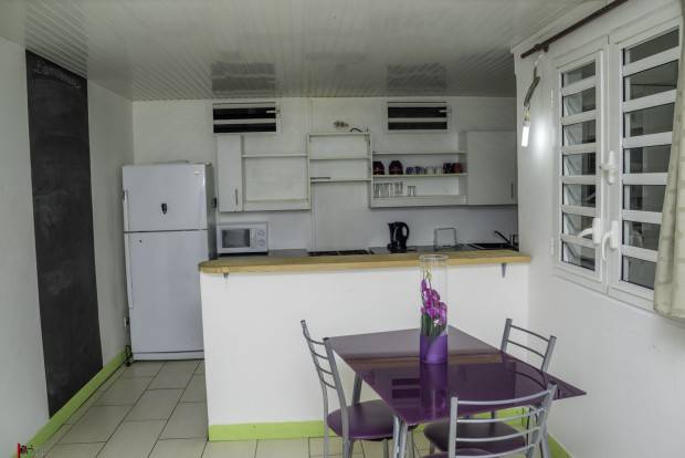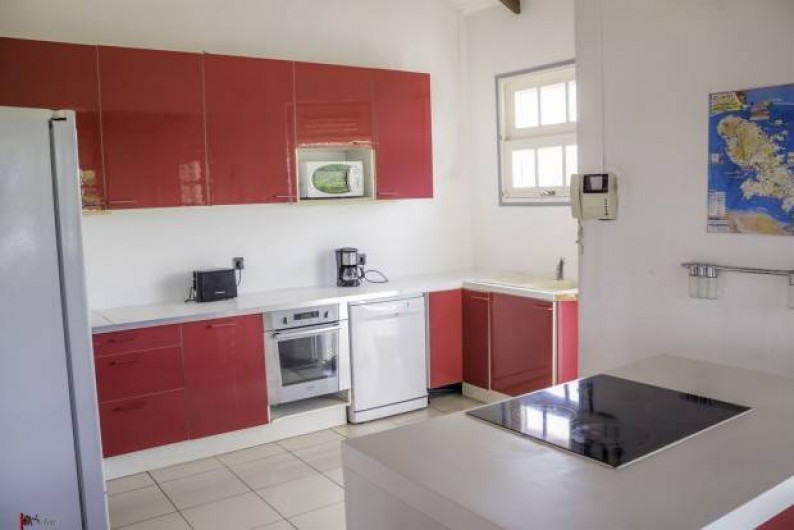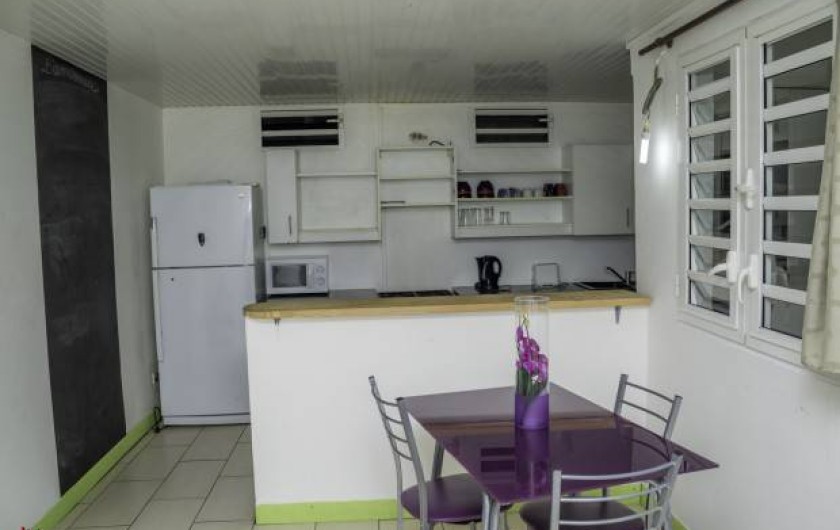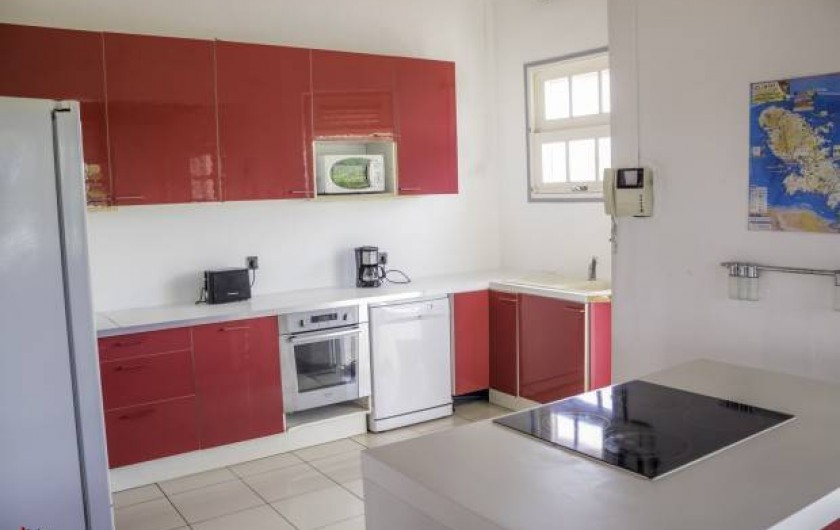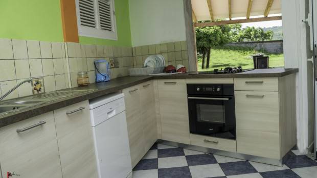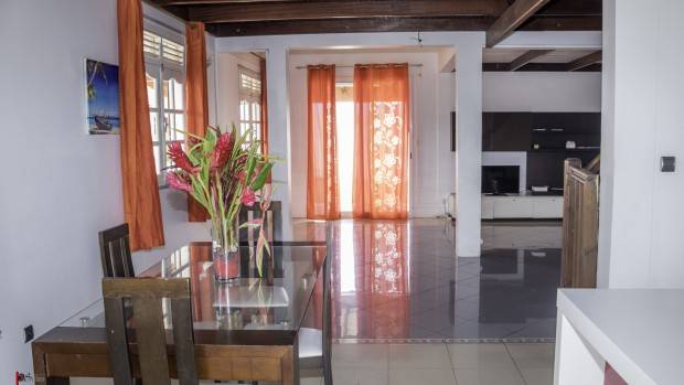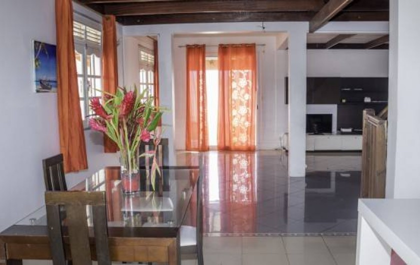 Une salle à manger et une grand cuisine à l'américaine toute équiquée ouverte sur la véranda avec vue sur le front de mer du Robert.