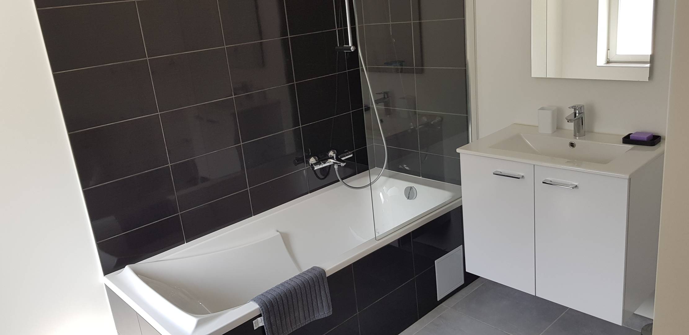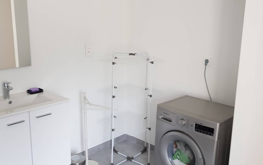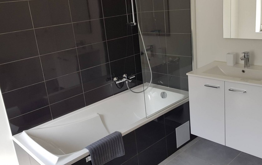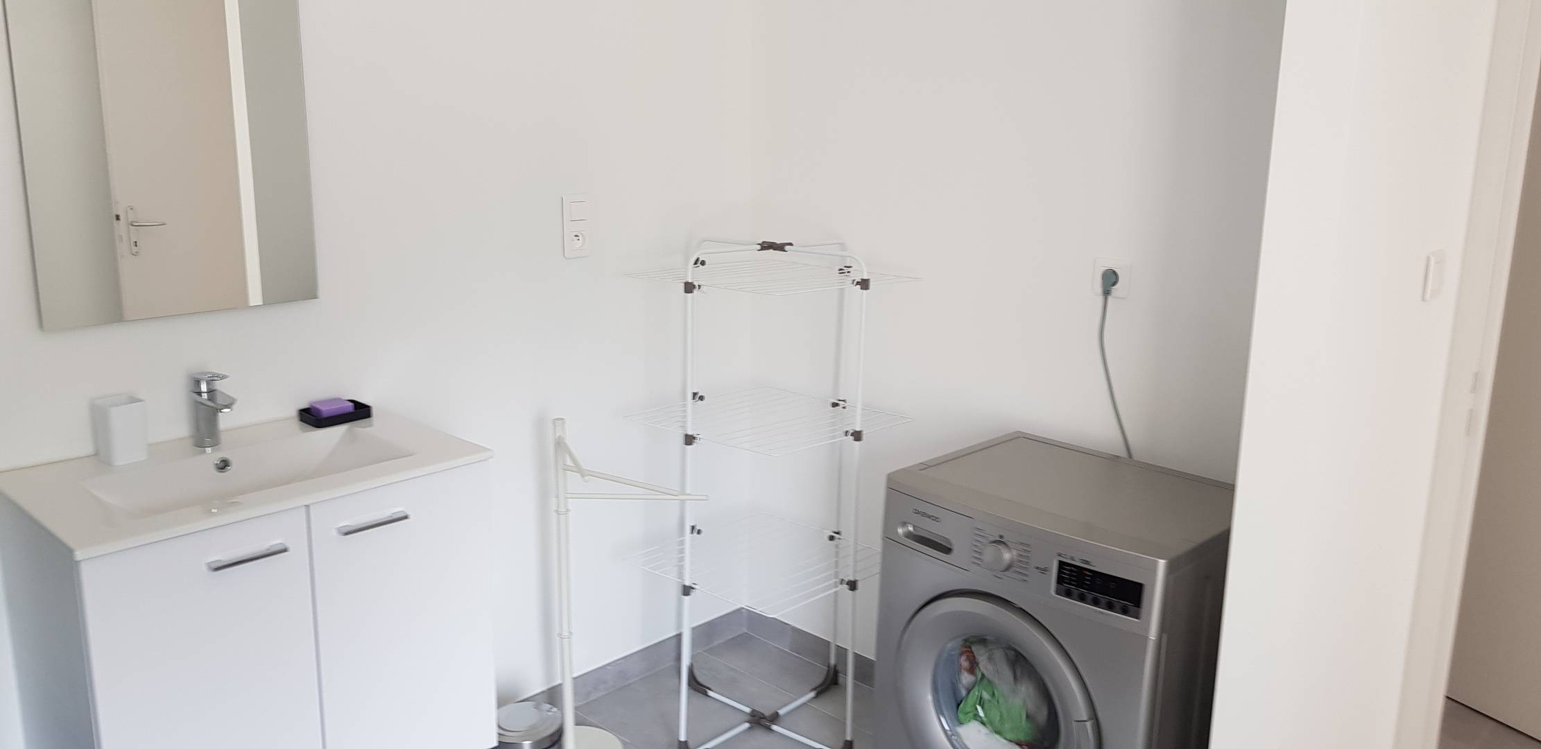 Salle de bains refaite à neuf, avec baignoire-douche, lave-linge 7 kg, radiateur sèche serviettes. WC séparé.