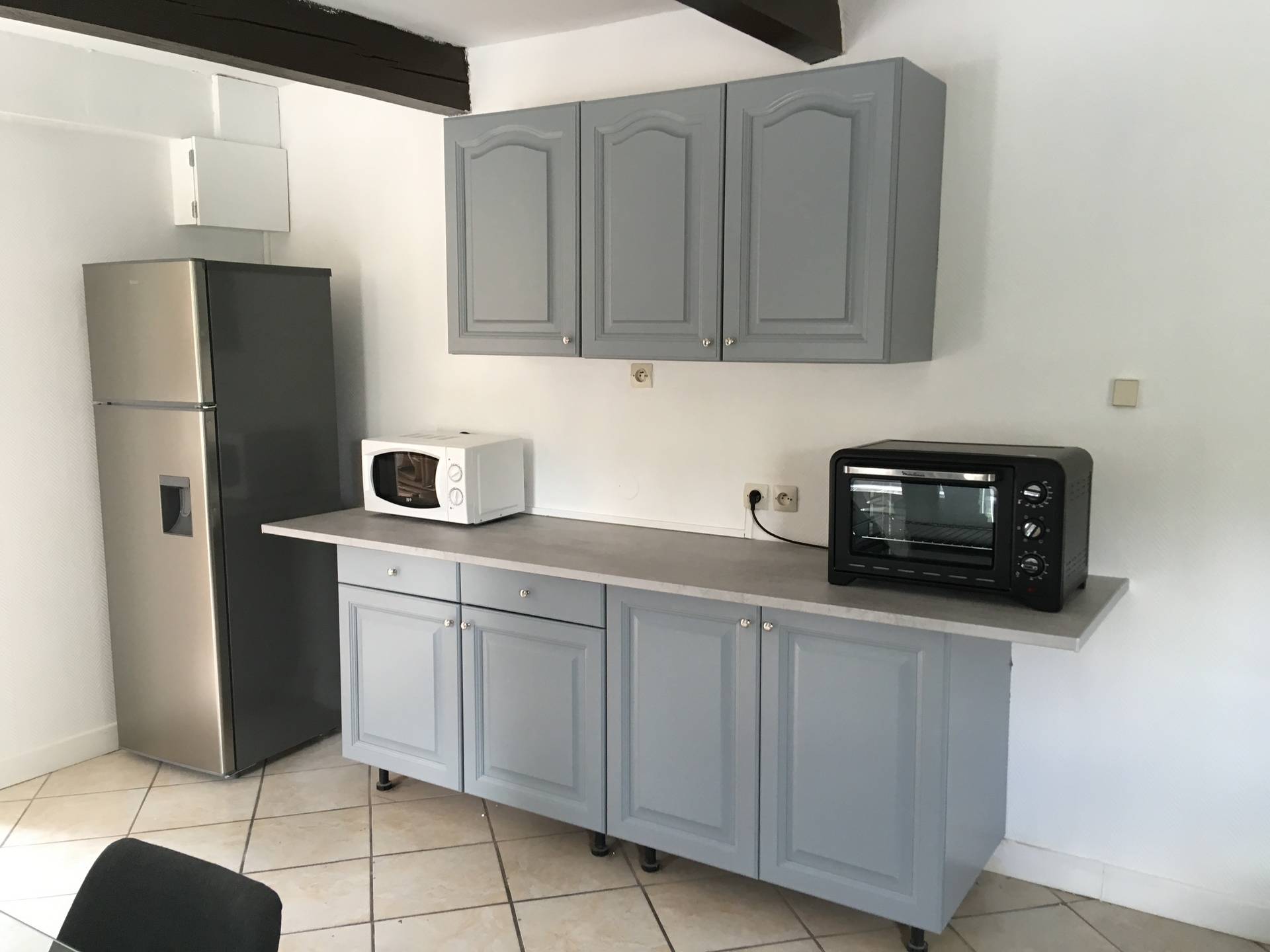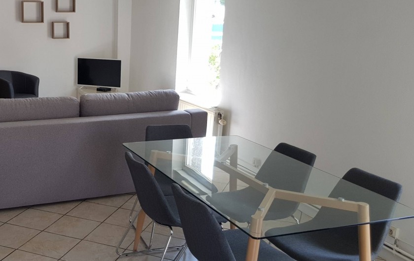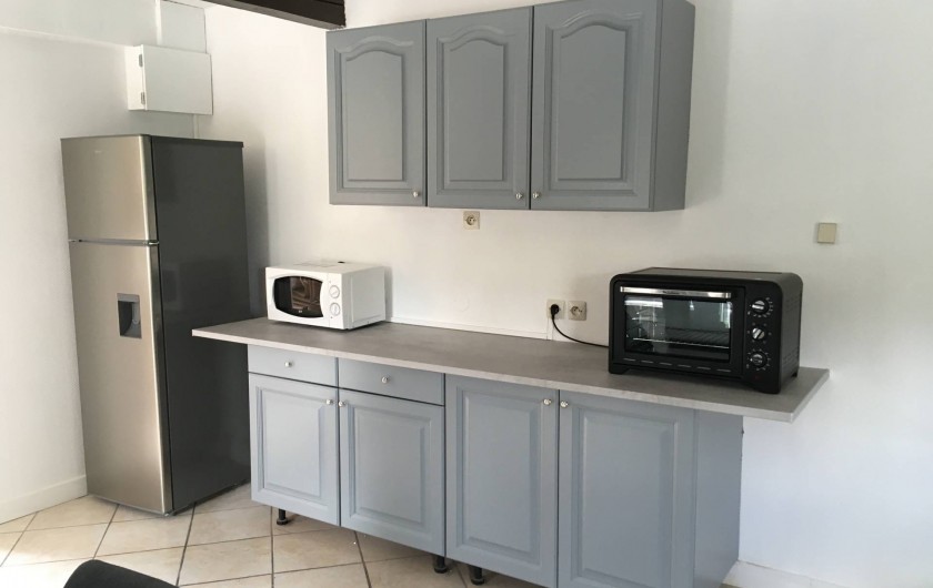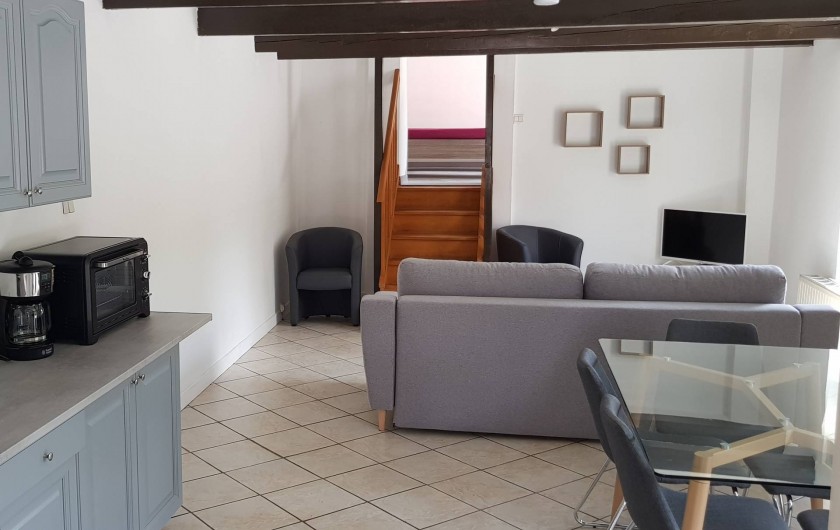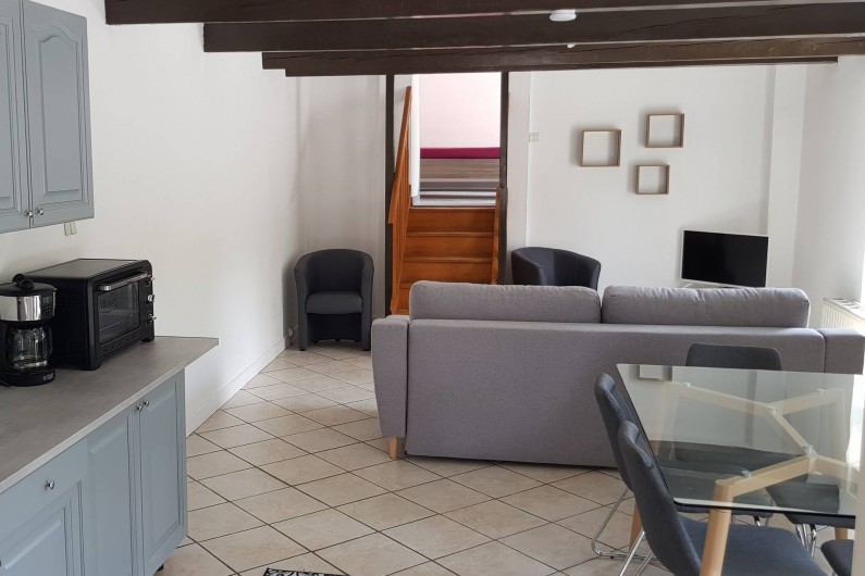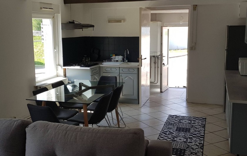 pièce à vivre composée d'un salon avec canapé convertible couchage deux personnes, salle à manger et cuisine ouverte composée d'un réfrigérateur-congélateur, mini-four, four micro-ondes, plaques de cuisson au gaz, appareil à raclette, cafetière électrique programmable, bouilloire, grille pain.