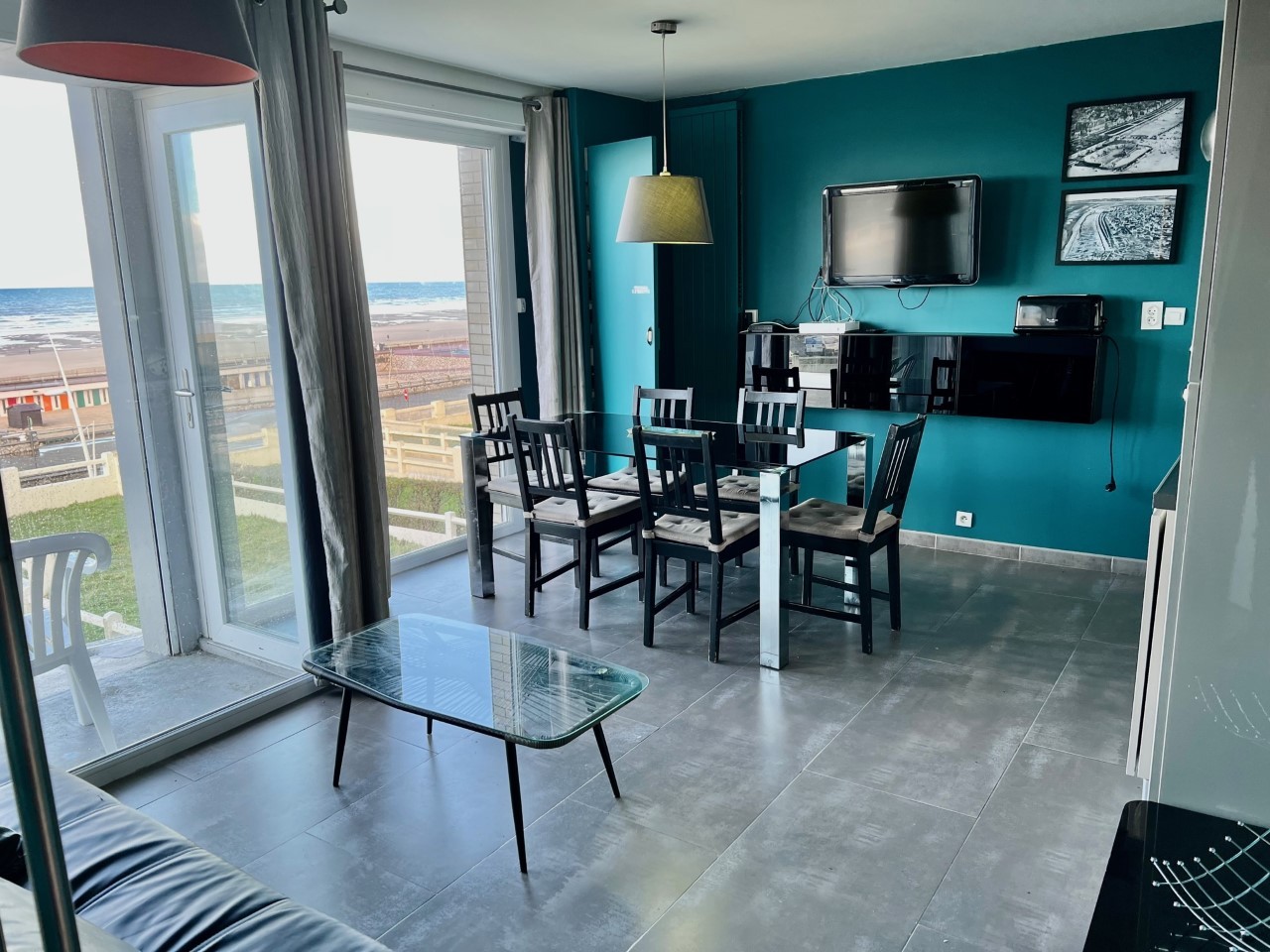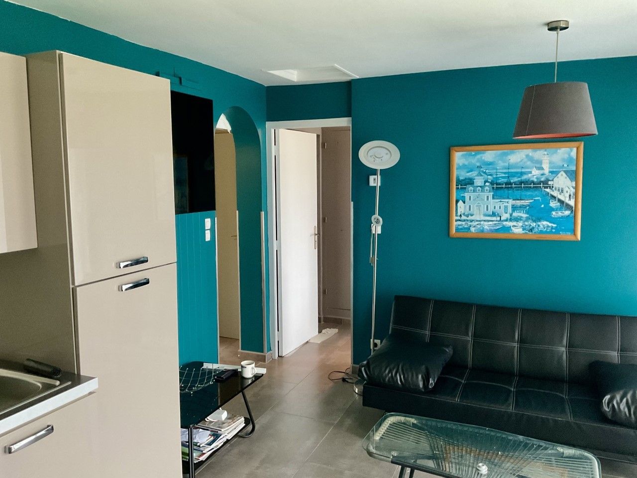 Beau séjour lumineux, cuisine équipée moderne (lave-vaisselle),