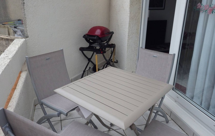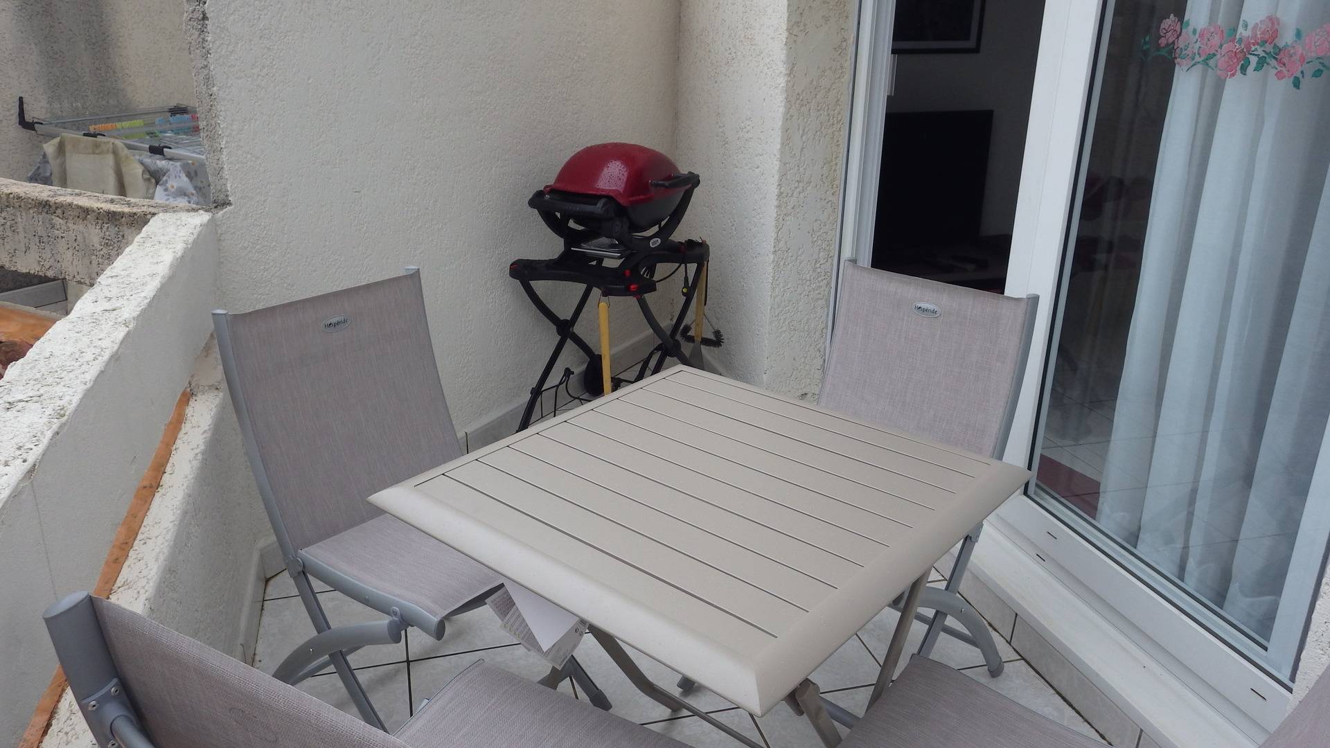 Terrasse équipée d'une table, 4 chaises et un barbecue Weber électrique .