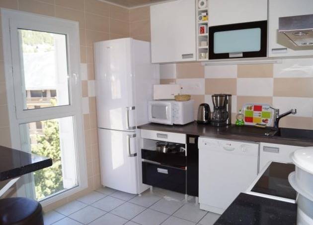 droite, la cuisine est bien équipée (cuisinière vitro-céramique avec hotte, lave-vaisselle, réfrigérateur/congélateur, four micro-ondes) et dotée d’un matériel de cuisson Pyrex complet et divers petits appareils d’électro-ménager (cafetière, bouilloire, mixeur...). Un minibar constitue un coin petit-déjeuner ou goûter très apprécié.