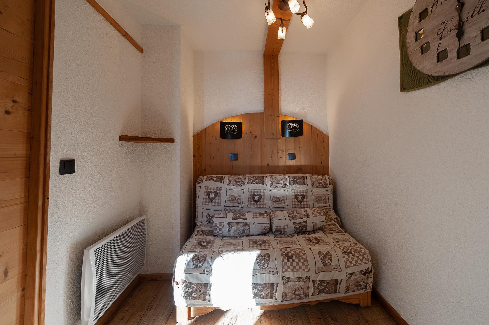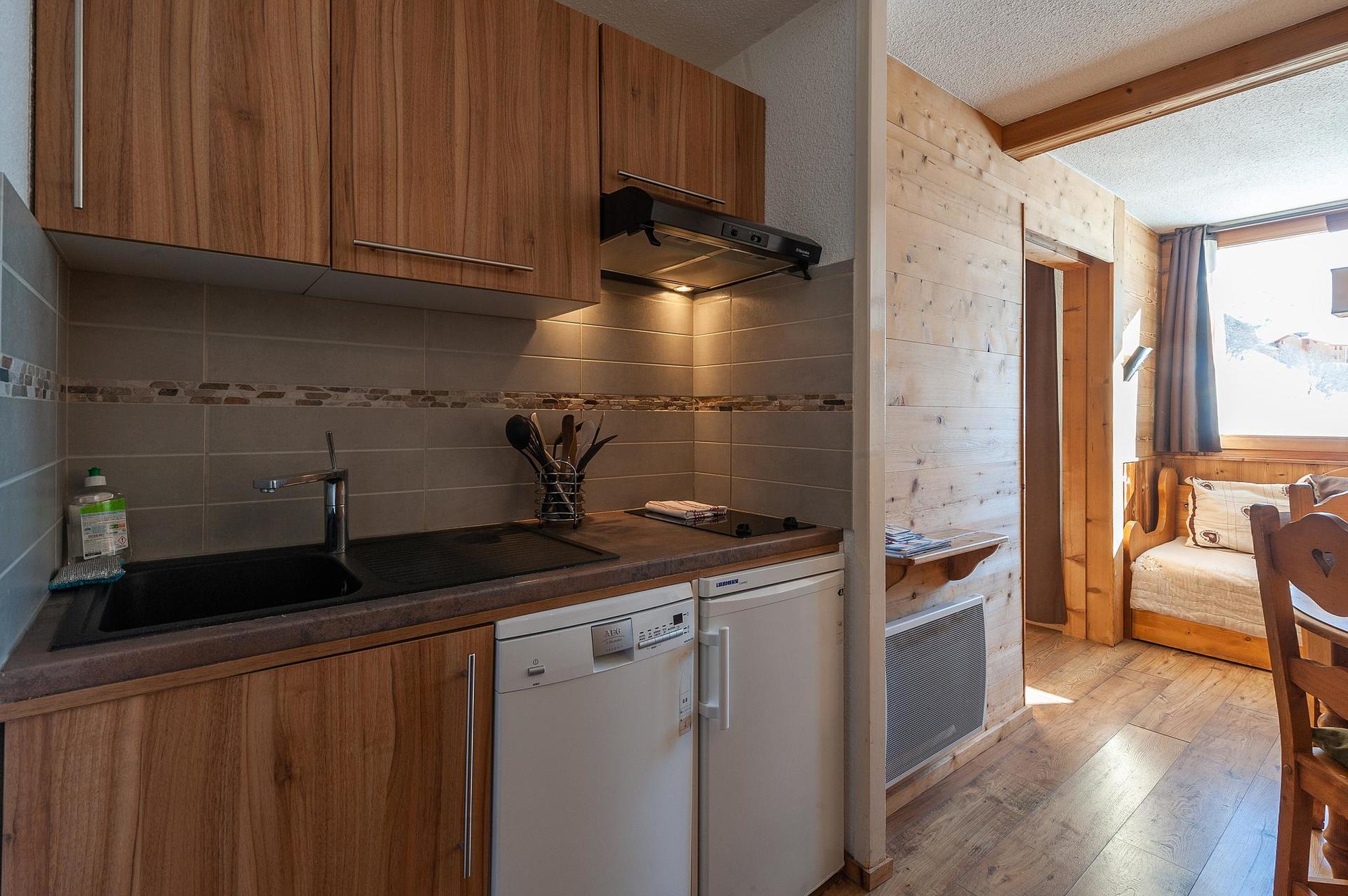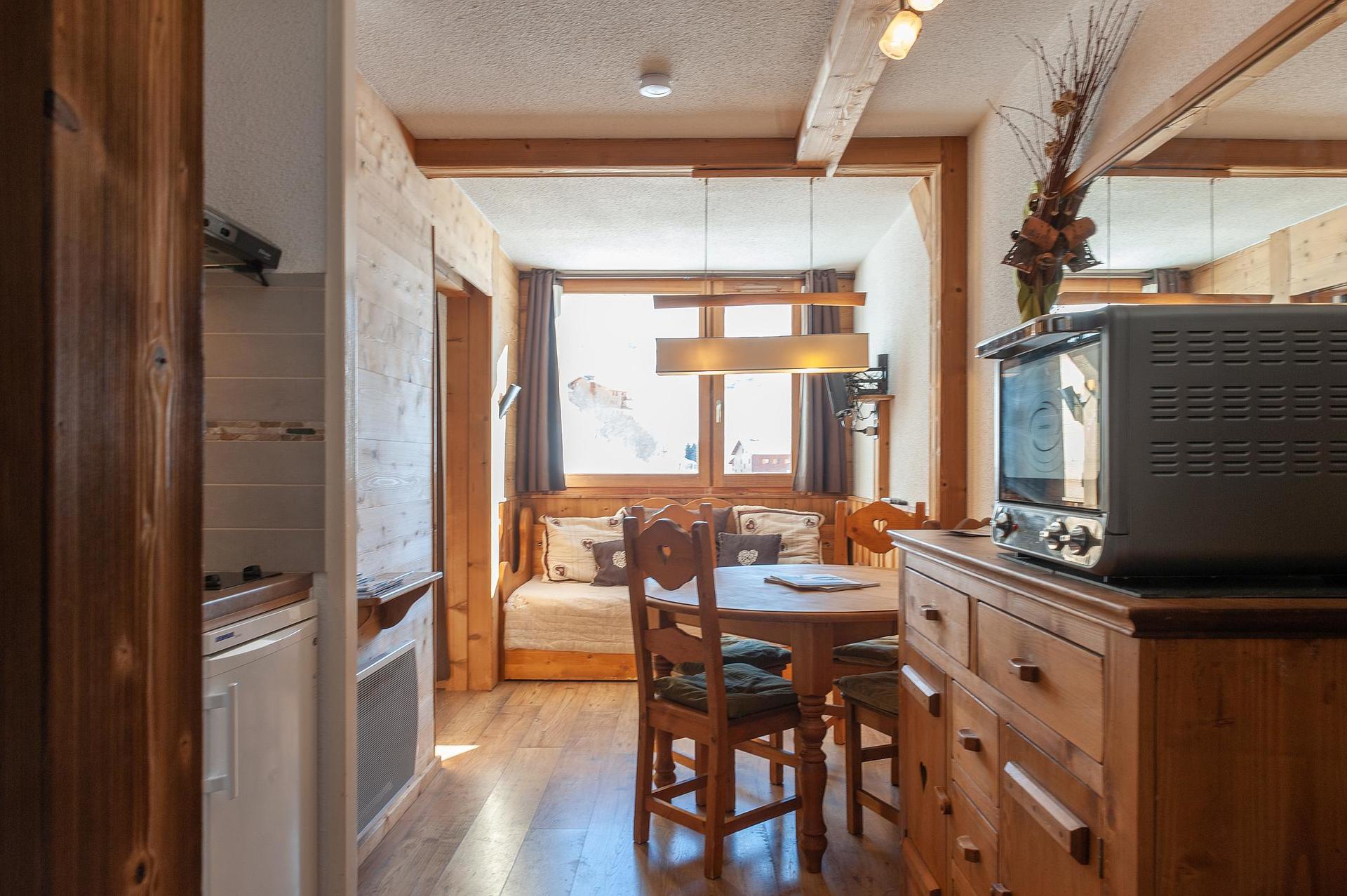Les Menuires, Grand Reberty, Résidence Median n°219 Studio divisible 4 personnes, 23 m², 2ème étage, Exposition Sud, Vue montagne, Skis aux pieds. Label qualité hébergement : 3 Flocons Or Cuisine : 2 plaques vitrocéramiques, hotte, four, micro-ondes, réfrigérateur, congélateur, lave-vaisselle, cafetière électrique, bouilloire, grille-pain, appareil à raclette, fondue Séjour : 1 banquette 80 cm et 1 lit gigogne 80 cm Télévision écran plat Chambre : 1 canapé BZ 140 cm Salle de bains : lavabo, douche, WC, sèche serviette