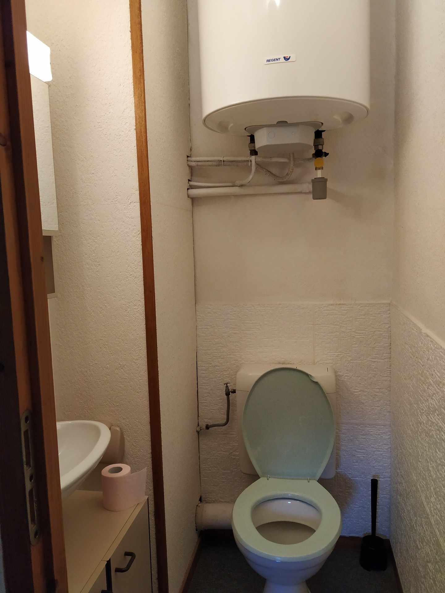 wc au R C : machine a laver , etageres pour produits entretien .