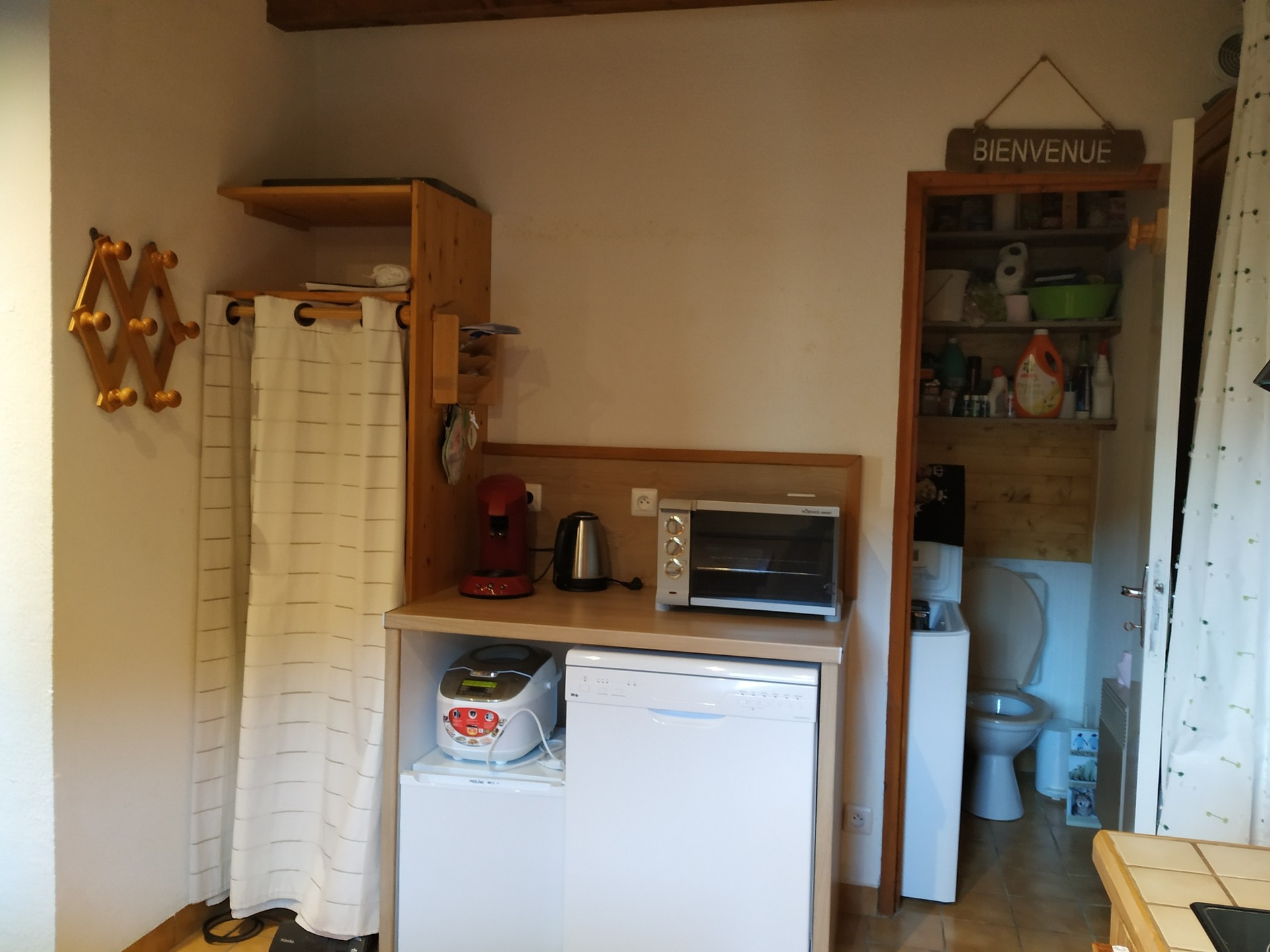 Cuisine:2 frigos,lave vaisselle, four,1 congelateur top, buffet avec bcp vaisselle et ustensiles nombreux de cuisson. Petit electromenager=1cafetiere,poste de radio ,four a pizza -tartes epaisses,1 moulinex type cookéo, 1 cafetiere,1 crepiere