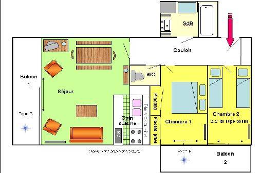 Appartement 50m² agréé label qualité ' 2 Alpes Qualité Ambiance Montagne et 3 Clévacances, pour 6/8 personnes , comprenant un séjour avec bed express 2 pers, volet roulant électrique, TV/DVD, coin cuisine avec micro-ondes,plaques Vitrocéramiques, lave-vaisselle, 2 chambres (lit double et 2x2 lits superposés), salle de bain avec sèche-serviette électrique et WC séparés, 2 grands balcons expo SE pour les chambres et Sud pour le séjour avec vue imprenable sur les pistes, 2ème étage avec ascenseur, parking de copropriété accessible par badge,