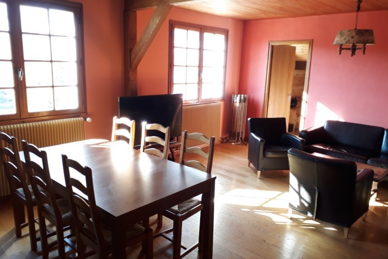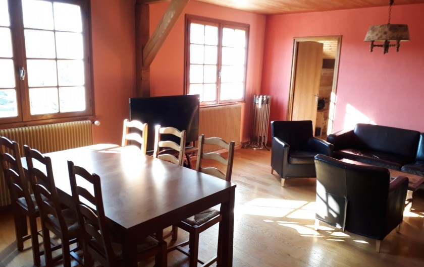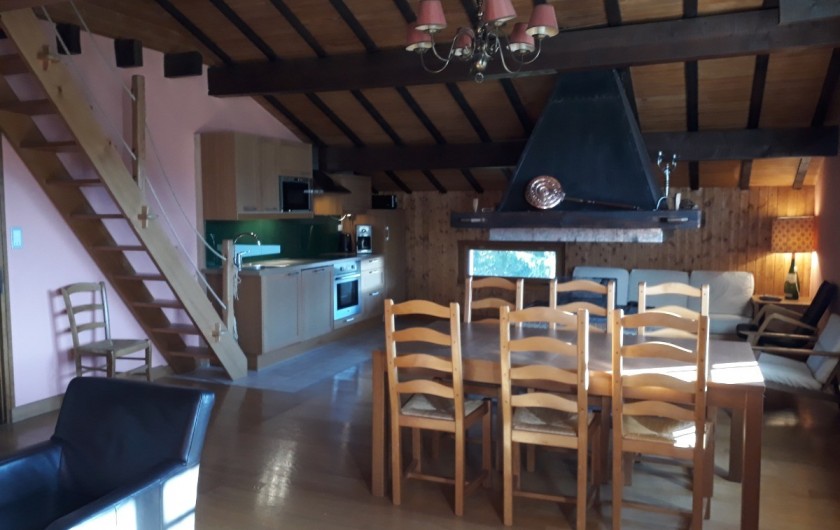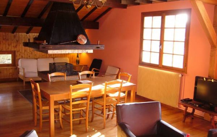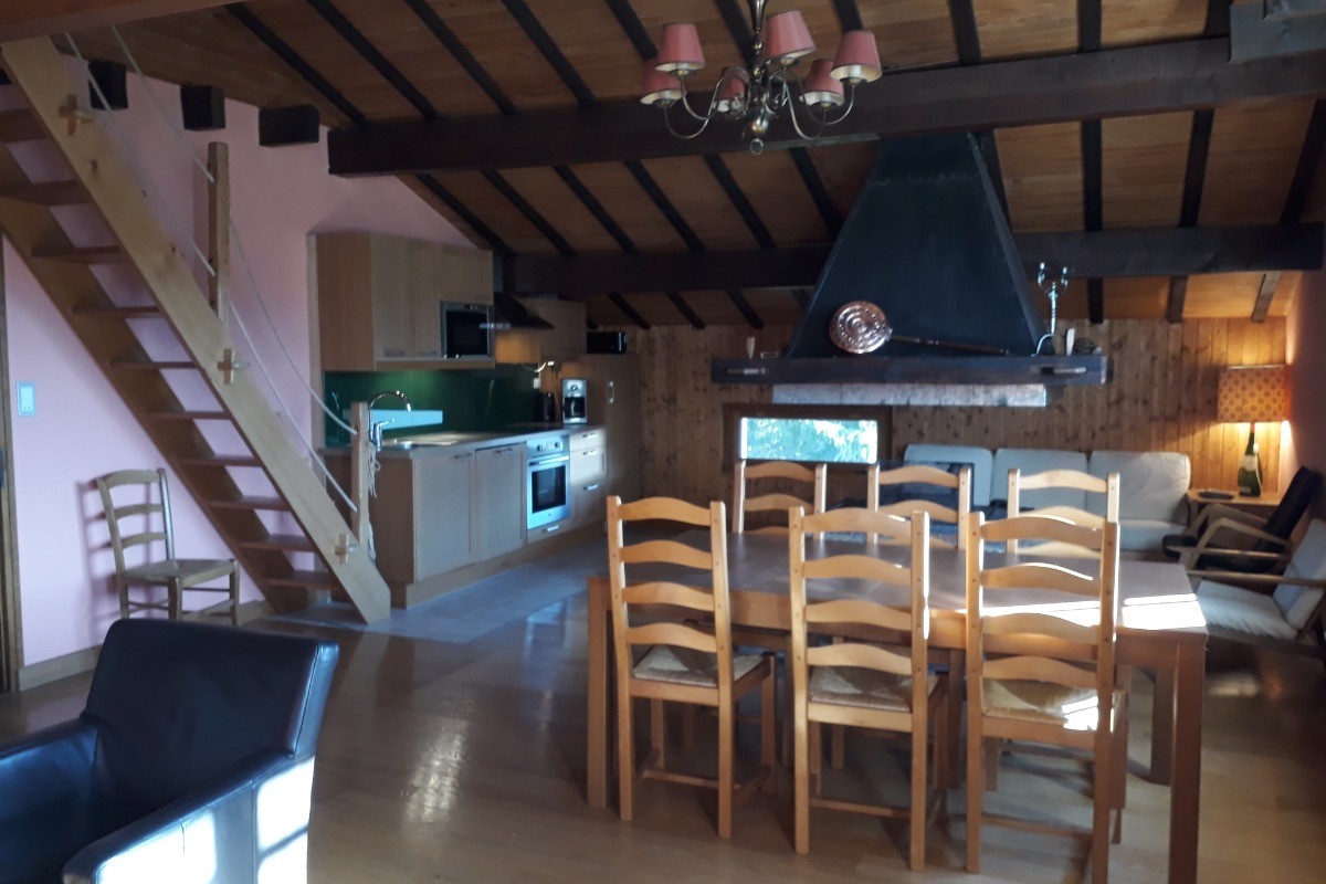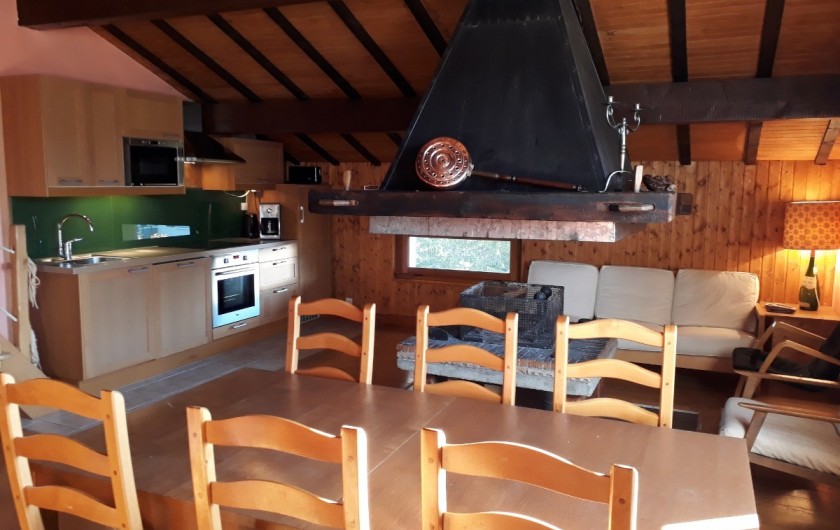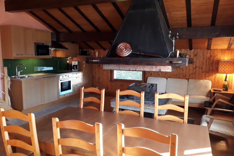 Découvrez le grand séjour avec cheminée centrale un coin détente est également présent pour admirer le feu. Retrouvez la cuisine intégrée toute équipée avec 4 vitro, micro-ondes, four électrique, lave-vaisselle, frigo, congélateur. Dans le séjour se trouve un espace repas équipé d'une table campagnarde et un espace salon avec canapé en cuir, TV grand écran plat, WIFI.