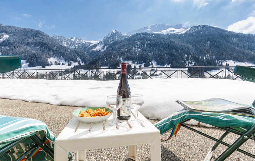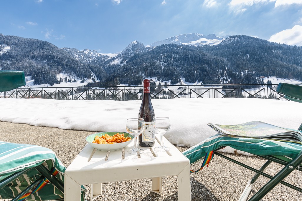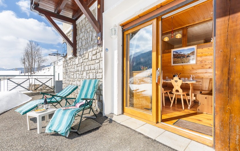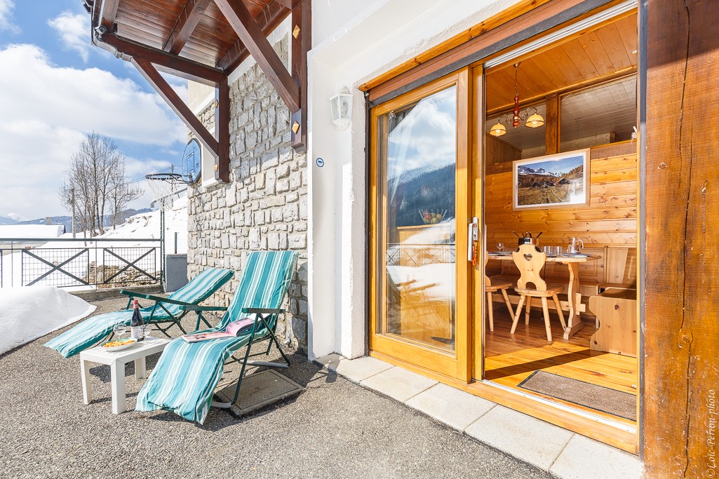 Terrasse privée à l appartement + 100 m² avec vue panoramique sur le Mt Blanc , terrasse fermée sécurisée idéale pour les jeunes enfants ( l été = football ....l hiver = construction igloo )