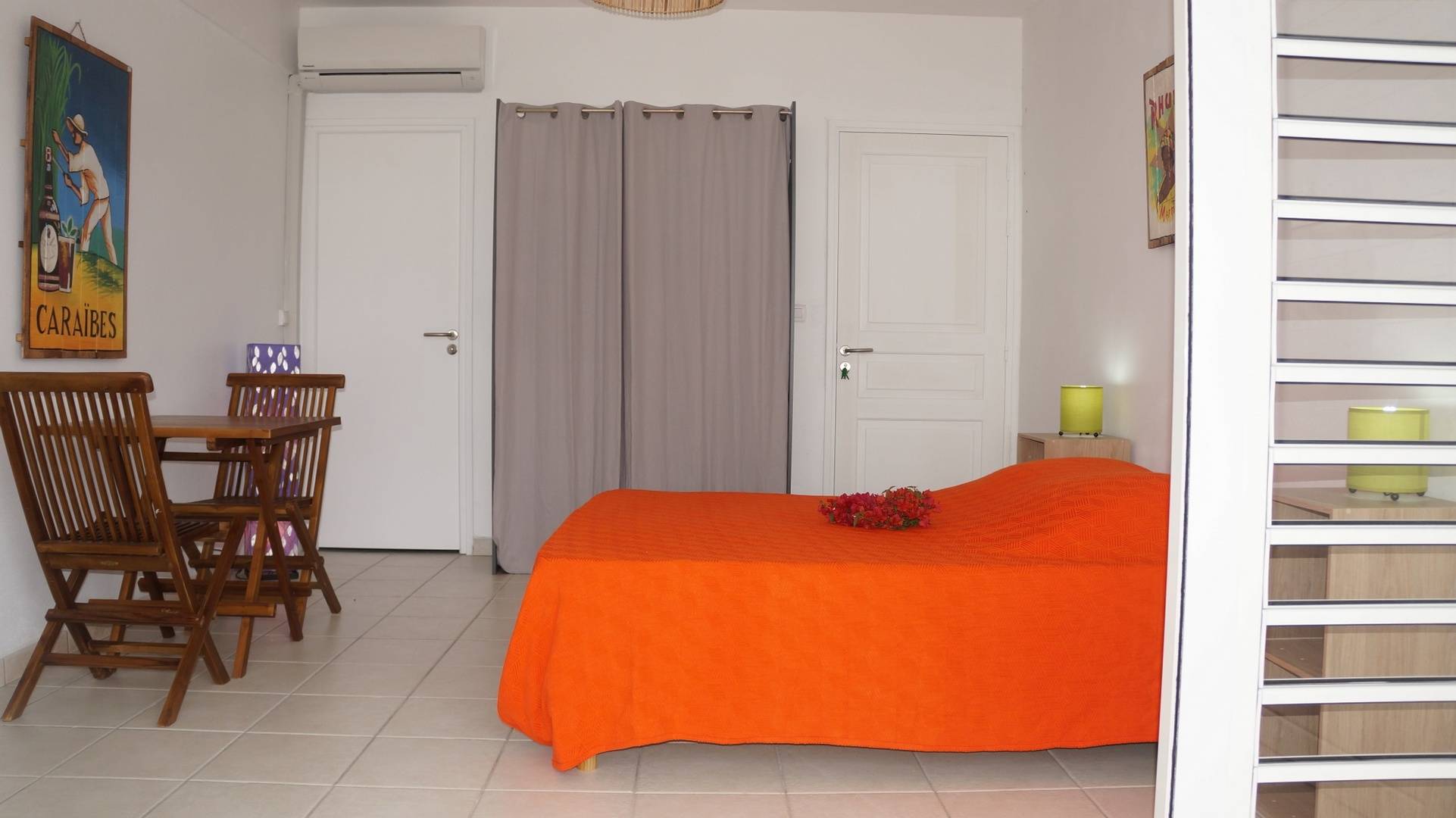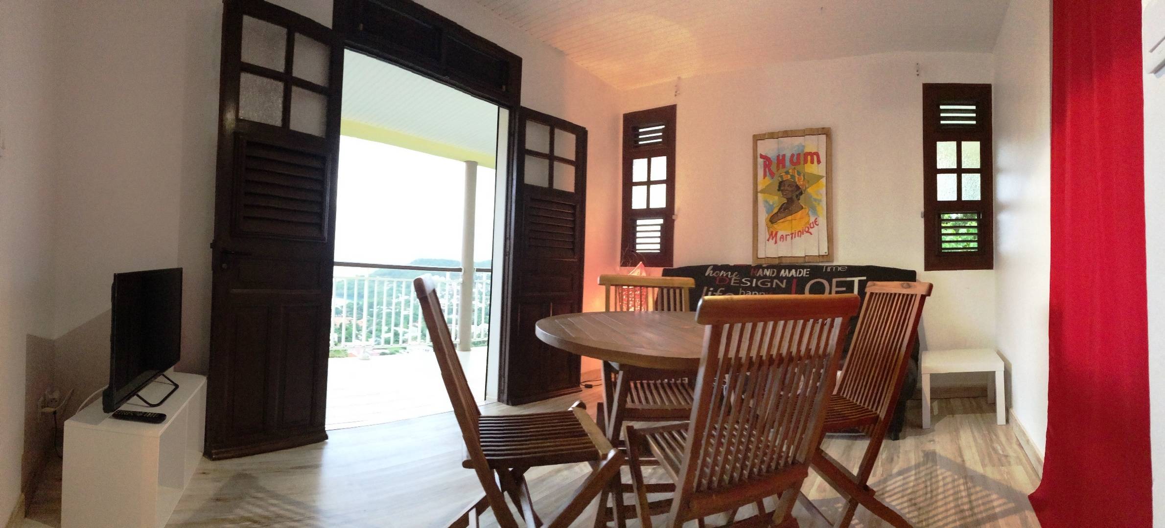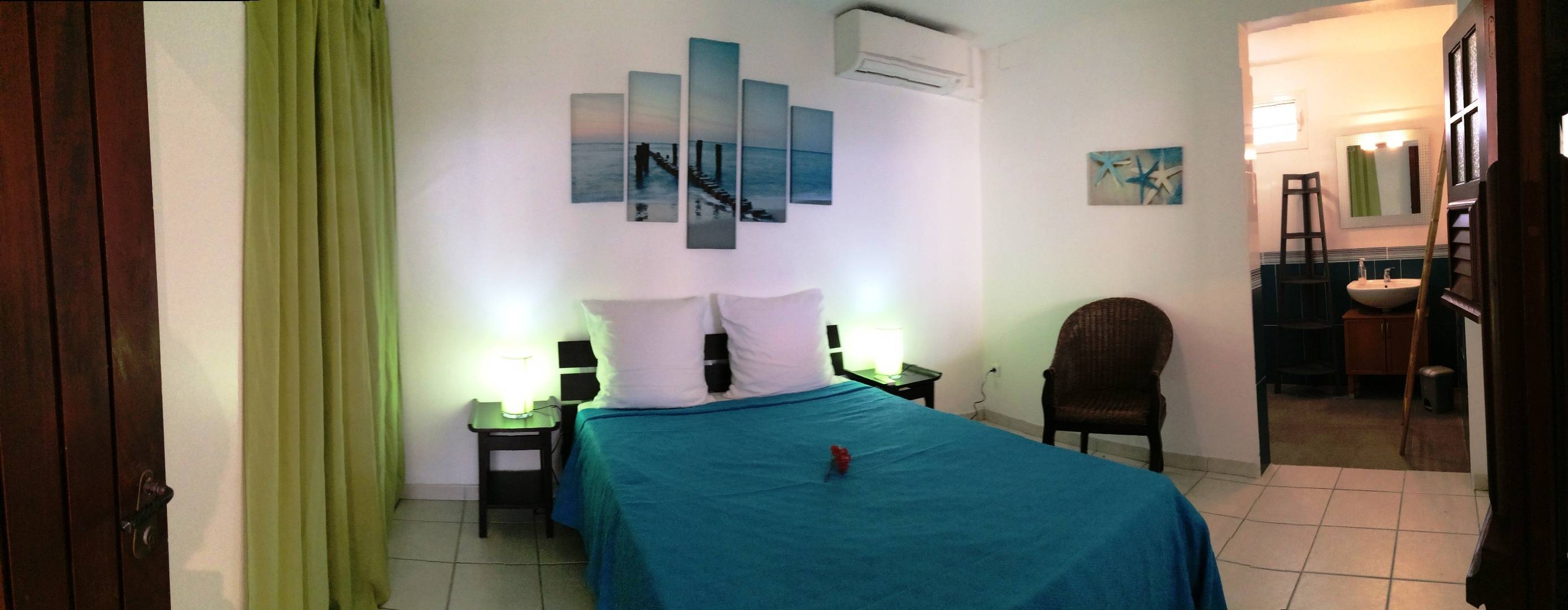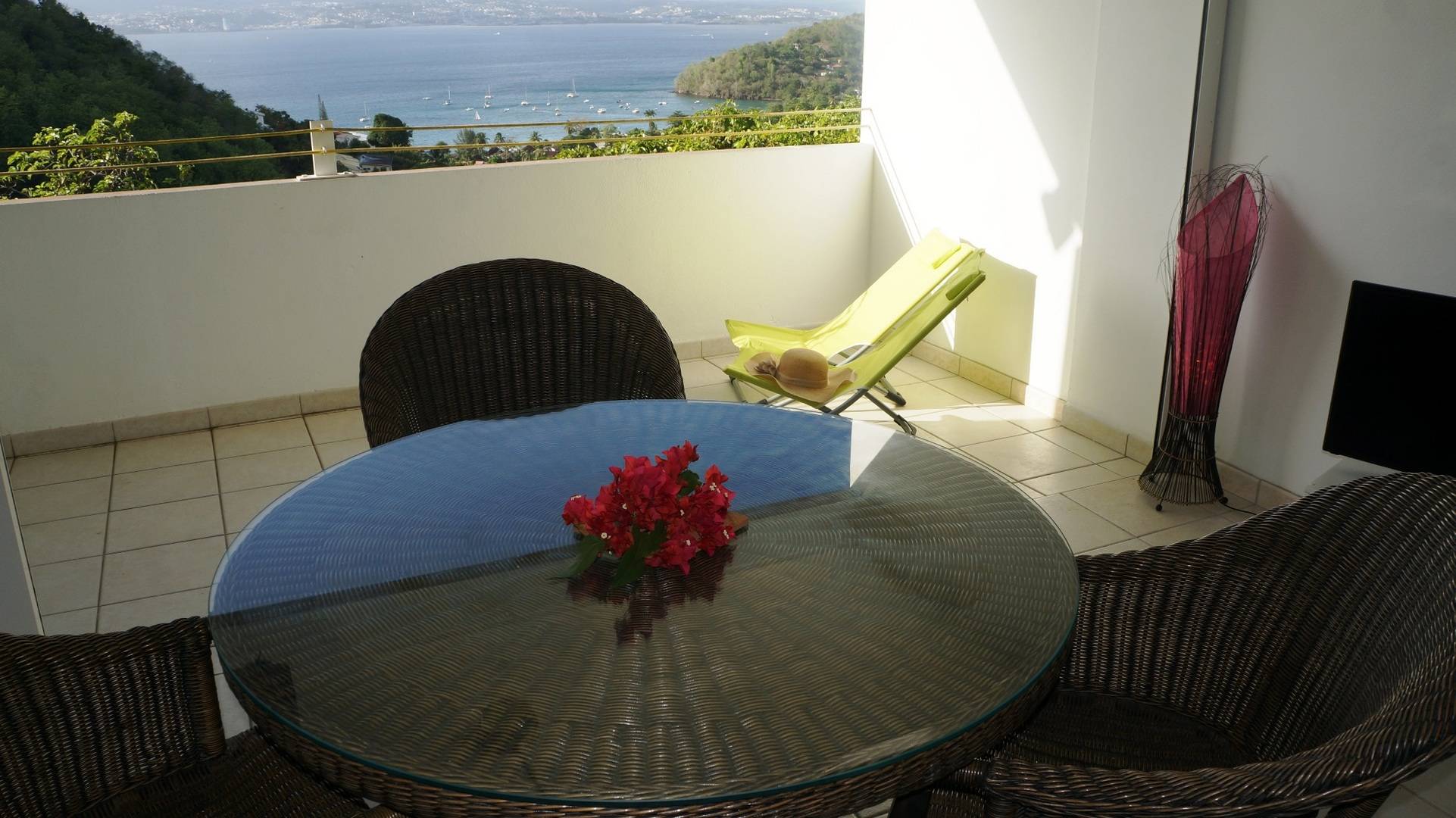 Climatisation : Oui. Tous les appartements sont orientés au nord-ouest (idéal en Martinique), avec des jalousies qui assurent une agréable ventilation par les alizés mais selon votre préférence vous pouvez les fermer et utiliser la climatisation. Les appartements « Pierre », « Raphaëlle » et « Anna » ont un large volet roulant électrique qui transforme votre séjour en un grand espace ouvert sur la terrasse.