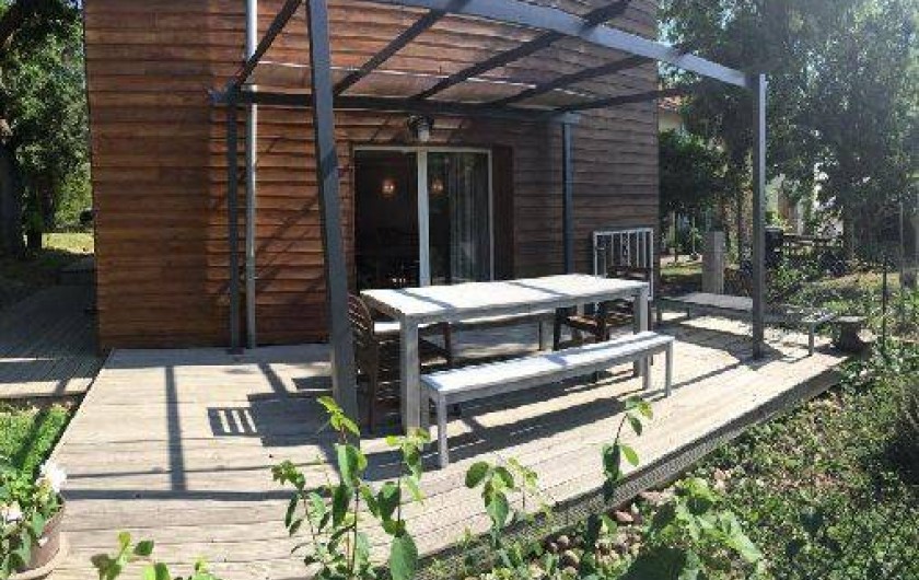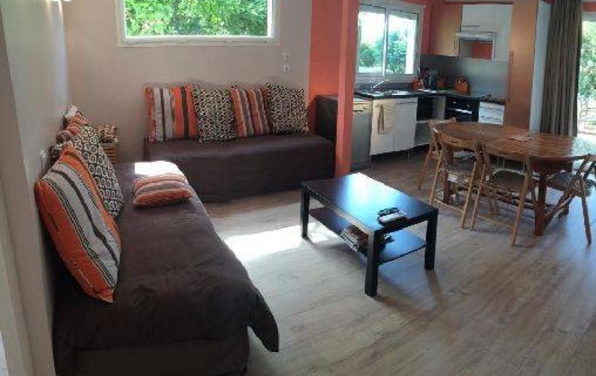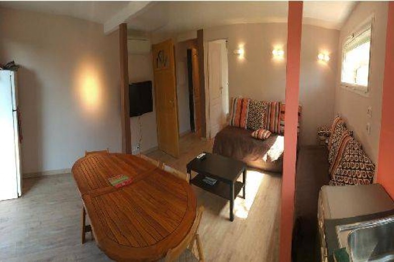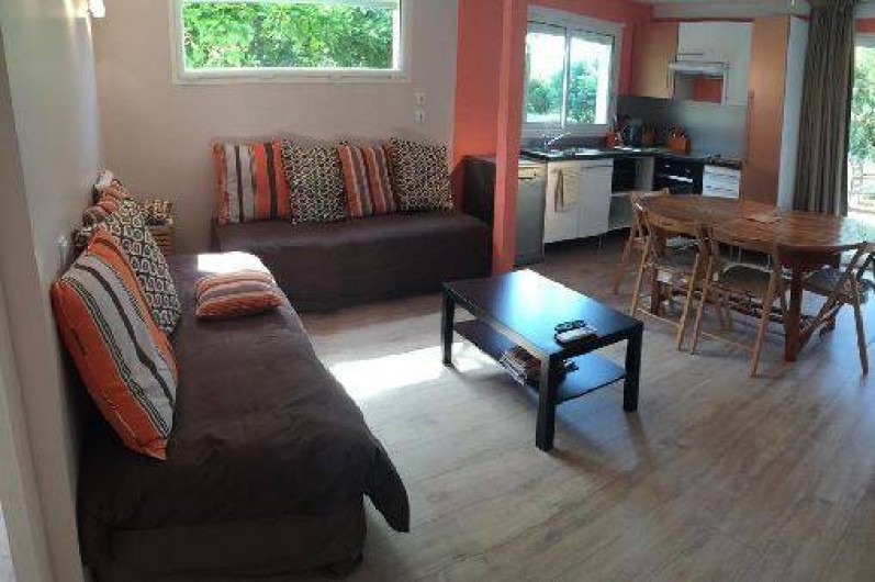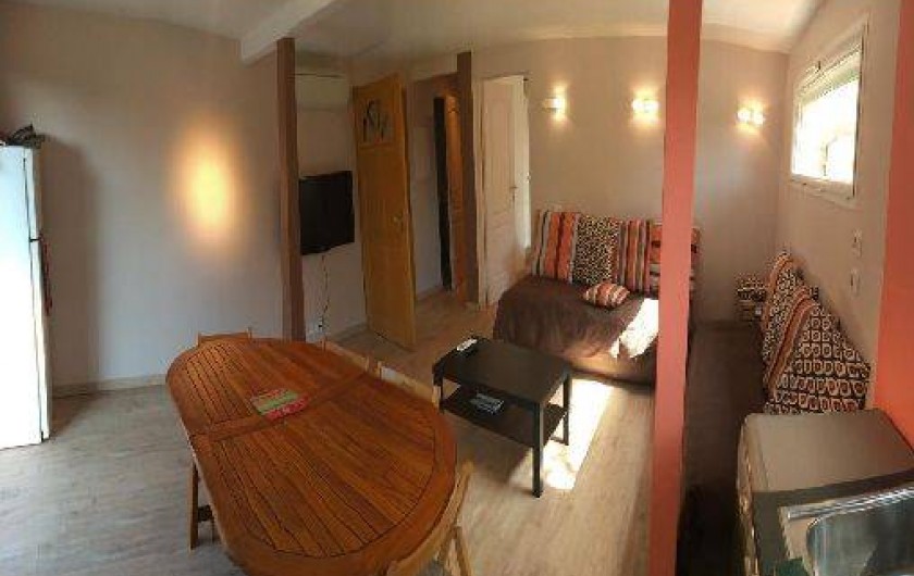Un salon avec 2 lits, télévision trés grand écran, climatisé, grande terrasse de 25m° Vue sur la piscine.
