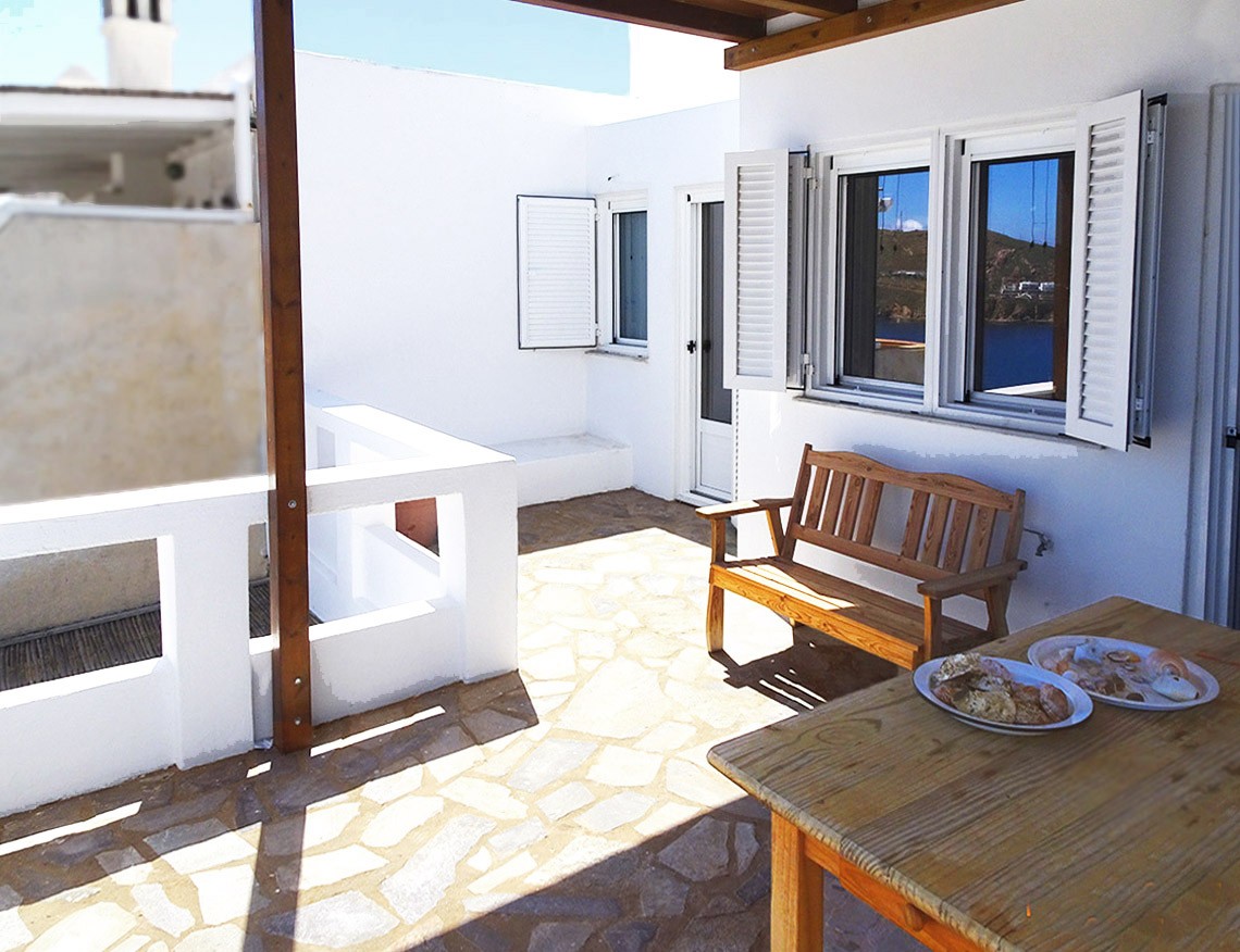The main terrace of the house has a stunning view of the bay of the port and the Chora village. It is equipped with a large dining table, sofa and chairs , a deck chair and everything you need to enjoy your lunch /dinner outside with amazing views .