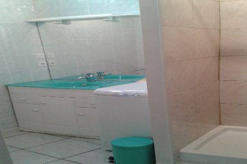 - une salle de bains avec douche, sèche serviettes et machine à laver le linge,