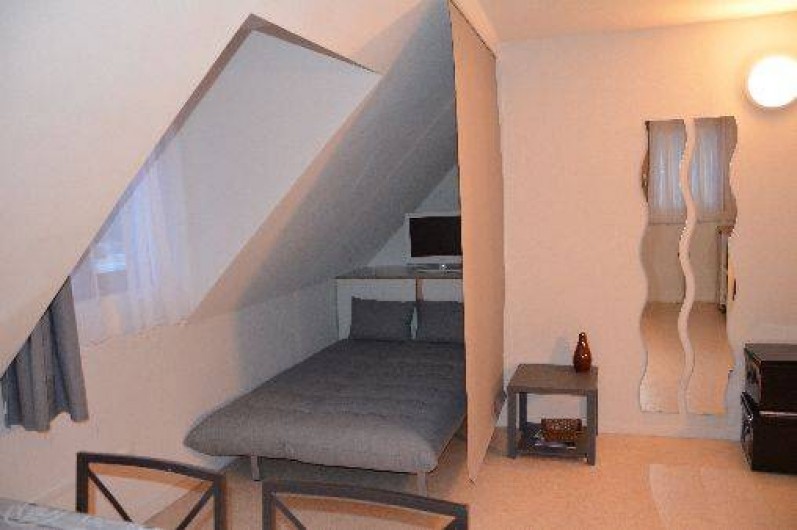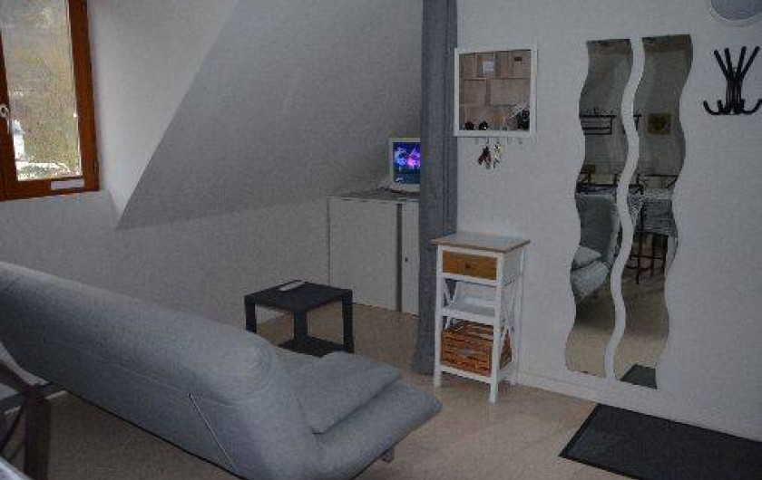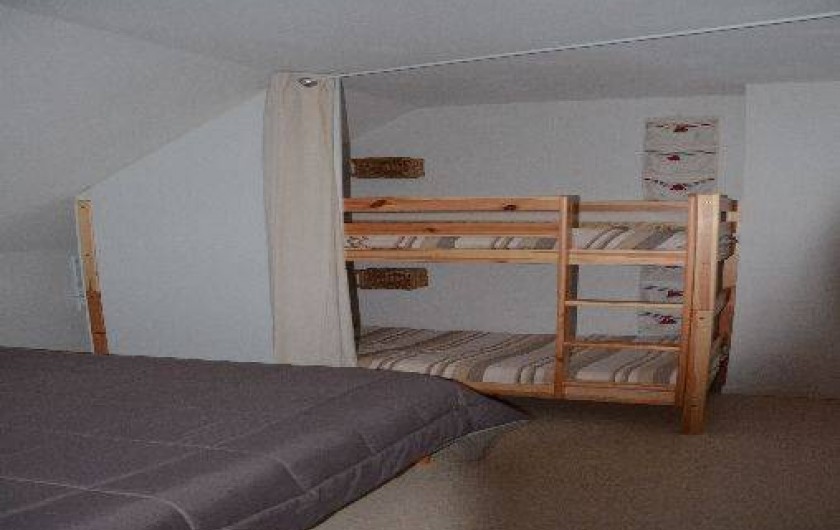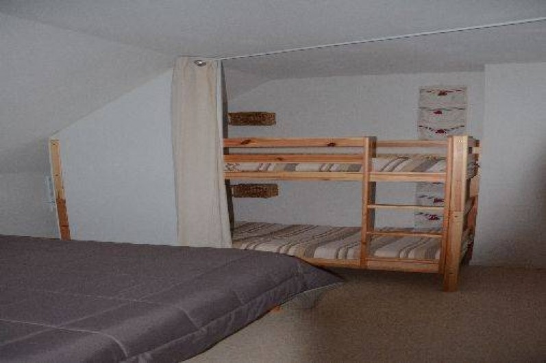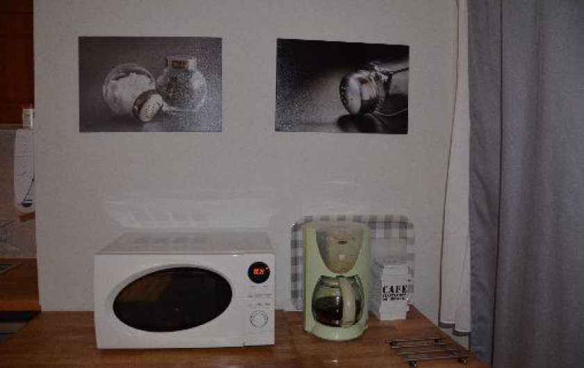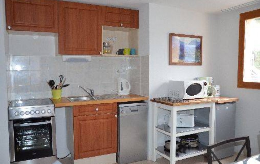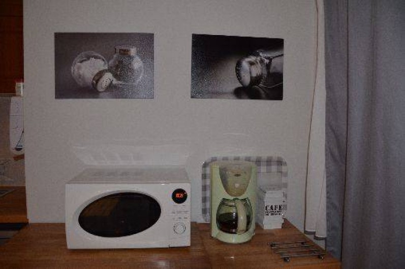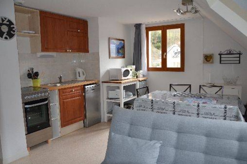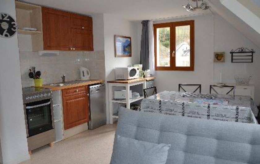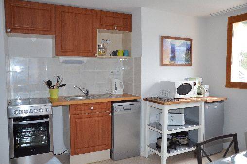 Un coin cuisine toute équipée, lave vaisselle, cuisinière avec plaques vitrocéramiques, micro-onde, appareil à raclette (et tout le nécessaire pour cuisiner), 1 chambre avec un grand lit et un coin couchette avec 2 lits superposés, 1 canapé clic-clac pour les deux couchages supplémentaires.