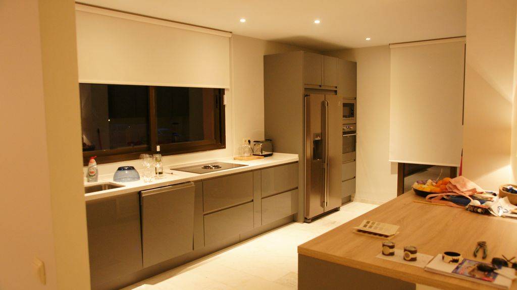 Cuisine super équipée : frigo américain avec congélateur et fabrique de glaçons - lave vaisselle - four - four microonde - plaques électriques avec hotte intégrée - armoire à vin - machine à laver - matériel électroménager complet.