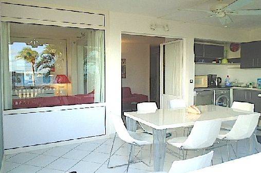 Rez de plage pour ce très bel appartement d'angle sans vis-à-vis de 55M2 avec une chambre fermée, climatisation et brasseur d'air au plafond, salle d'eau avec douche antillaise, dans le hall un wc indépendant, dans le salon fauteuils et téléviseur grand écran plat de 100cm, canal sat. internet/wifi, chaine stéréo lecteur CD, une l'alcôve de 8m2 avec convertible BZ et meuble de rangement.