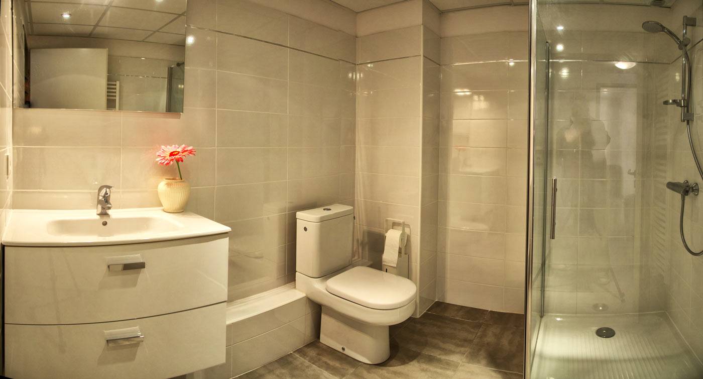 SALLE D'EAU : douche, wc, meuble vasque, chauffage sèche serviette, miroir, sèche cheveux, porte rouleau wc, brosse wc.
