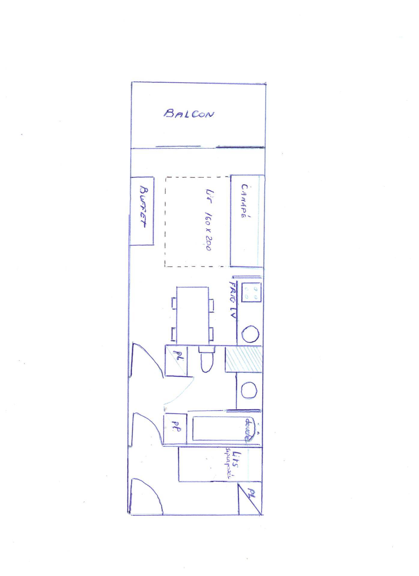 en 1,90 x 0,80 et placard . Cette chambre est séparée du séjour par deux portes entre lesquelles se trouve : une salle de bains avec baignoire et douche et WC.