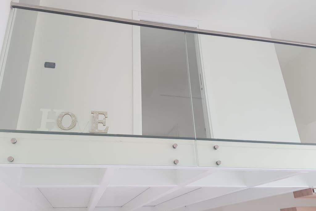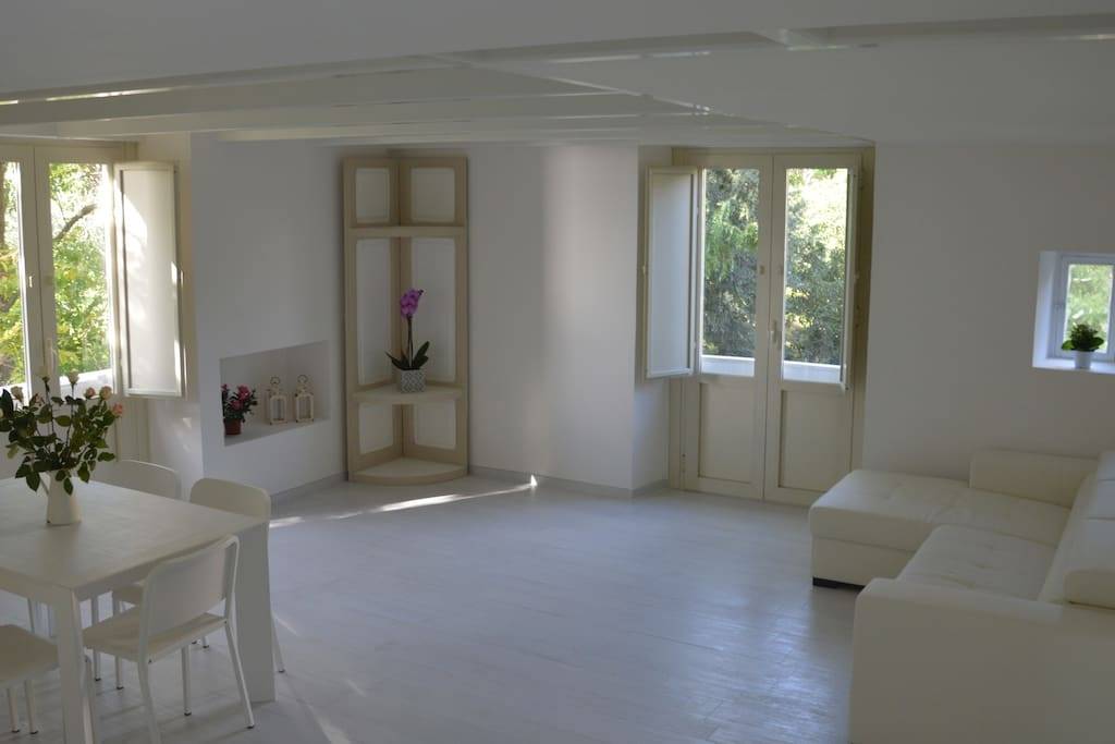 - Un grand salon avec canapé-lit (double), escalier en bois avec des marches en encorbellement, balustrade totalement verre, une fenêtre avec une vue relaxante du jardin, accès à la terrasse