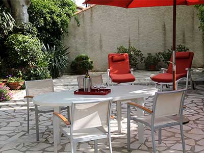 qui est classée « Monument Historique ». Les bâtiments, construits à la fin du XIXe siècle, furent longtemps la résidence de viticulteurs. Les dépendances qui entourent la Maison de Maître sont composées de quatre appartements individuels, confortablement meublés, d‘une superficie de 57 à 93 m2, et d‘un studio. Chaque unité se loue à la semaine. Les appartements, tous personnalisés, disposent d‘un séjour et d‘une cuisine américaine au rez-de-chaussée, de(s) chambre(s) à coucher et d‘une salle de bains à l‘étage. Chaque appartement a son propre petit jardin patio avec coin repas.