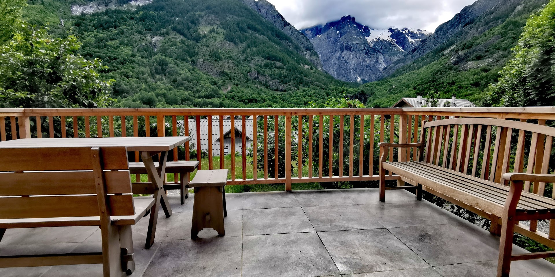 - Grande terrasse vue Pelvoux, équipée d'un Store, d'une table et bancs pour manger à l'extérieur l'été, transats.