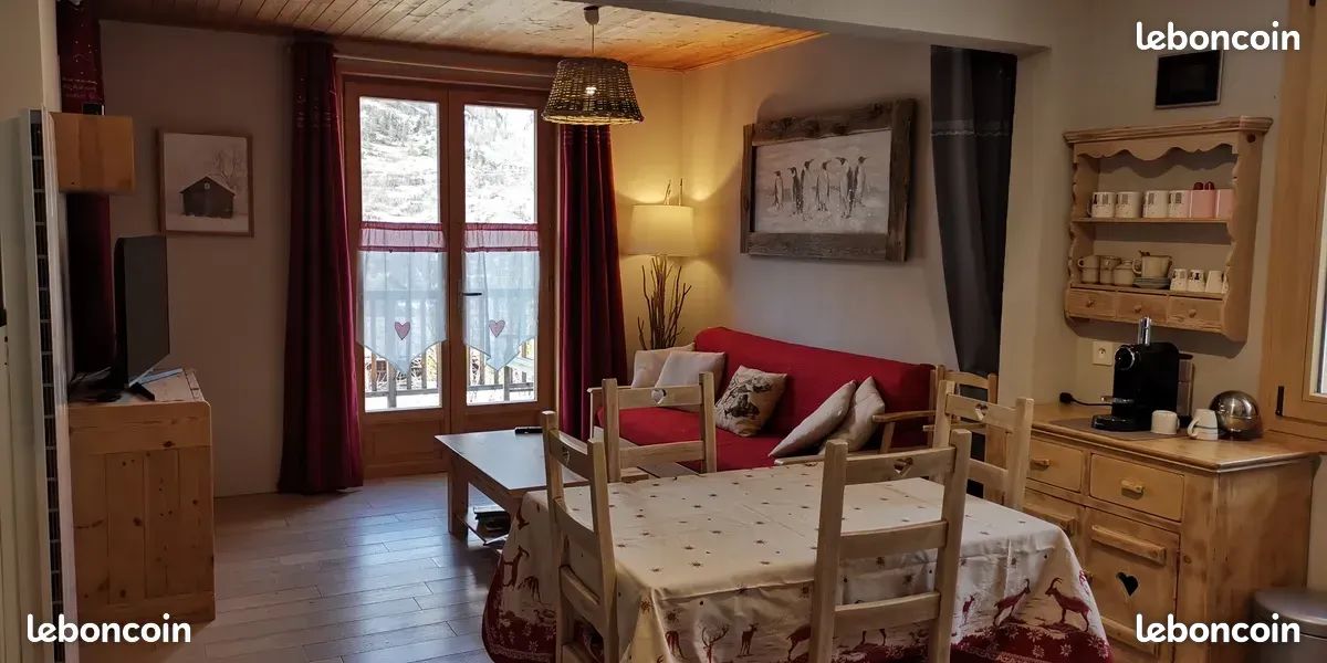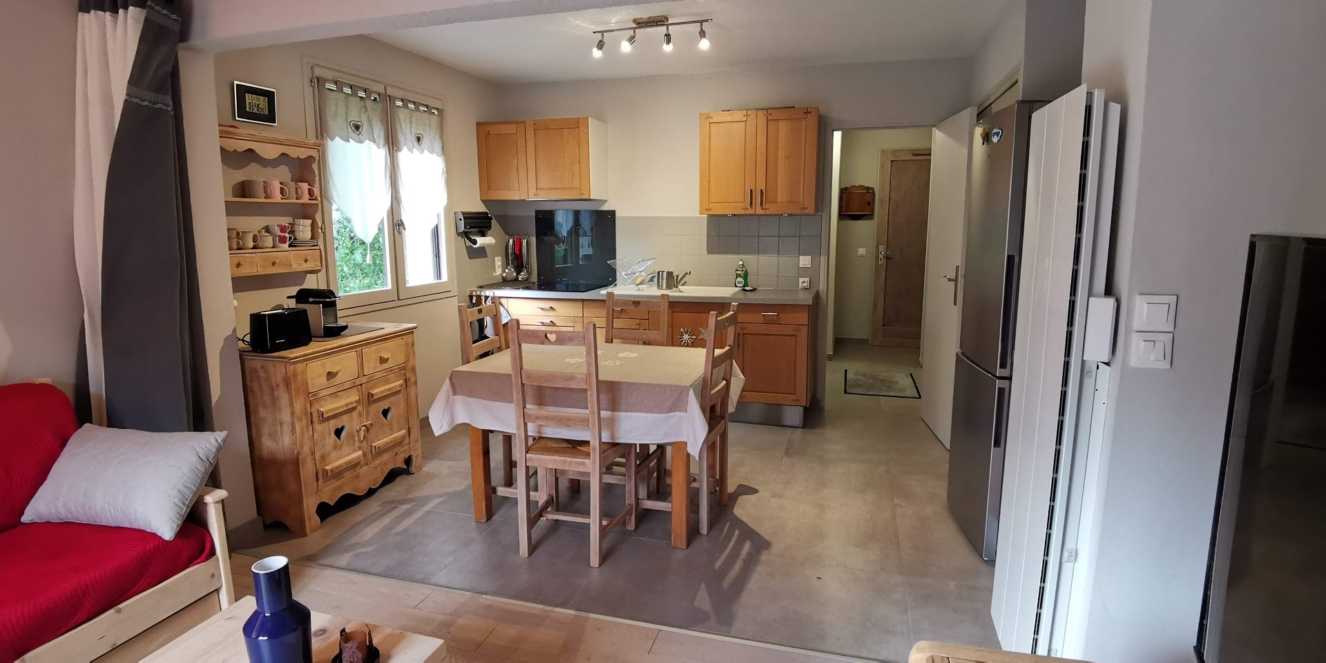 Grand Appartement confortable de 45 m² spacieux en rez-de-chaussée de chalet, pour 4 personnes (4 couchages), entièrement rénové avec grande terrasse (20 m2) orientée Ouest, vue sur le Pelvoux, situé à Pelvoux Saint Antoine/Les Claux, à l'entrée du PARC NATIONAL DES ECRINS à 1250 m d’altitude.