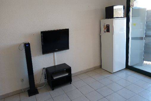 appartement situé au 3ème étage d'une résidence sécurisée avec terrasse avec vue sur la mer. composition: une chambre avec 2 lits superposés. une kitchenette avec plaque vitro,machine à laver le linge, frigo-congélateur, micro-onde,cafetière, ... Une pièce à vivre avec un canapé BZ, télévision écran plat, chaine hifi, placard, table. une grande terrasse avec salon de jardin et store banne. Ascenseur dans l'immeuble.