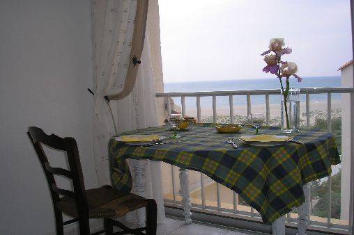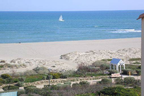 location duplex 5° et dernier étage dans résidence avec piscine en front de mer à Port-Leucate dans l'Aude; au 1° niveau une chambre avec lit 2 personnes et grand placard penderie; vue corbières grand placard dans le couloir salle d'eau wc séparés coin cuisine avec éléments intégrés et plan de travail en pierre séjour salon avec grande baie vitrée vue mer au 2° niveau grande chambre matrimoniale avec armoire penderie coiffeuse vue corbières grande mezzanine avec velux ouvrant et occultable, 3 couchages individuels, commode et placard de rangement