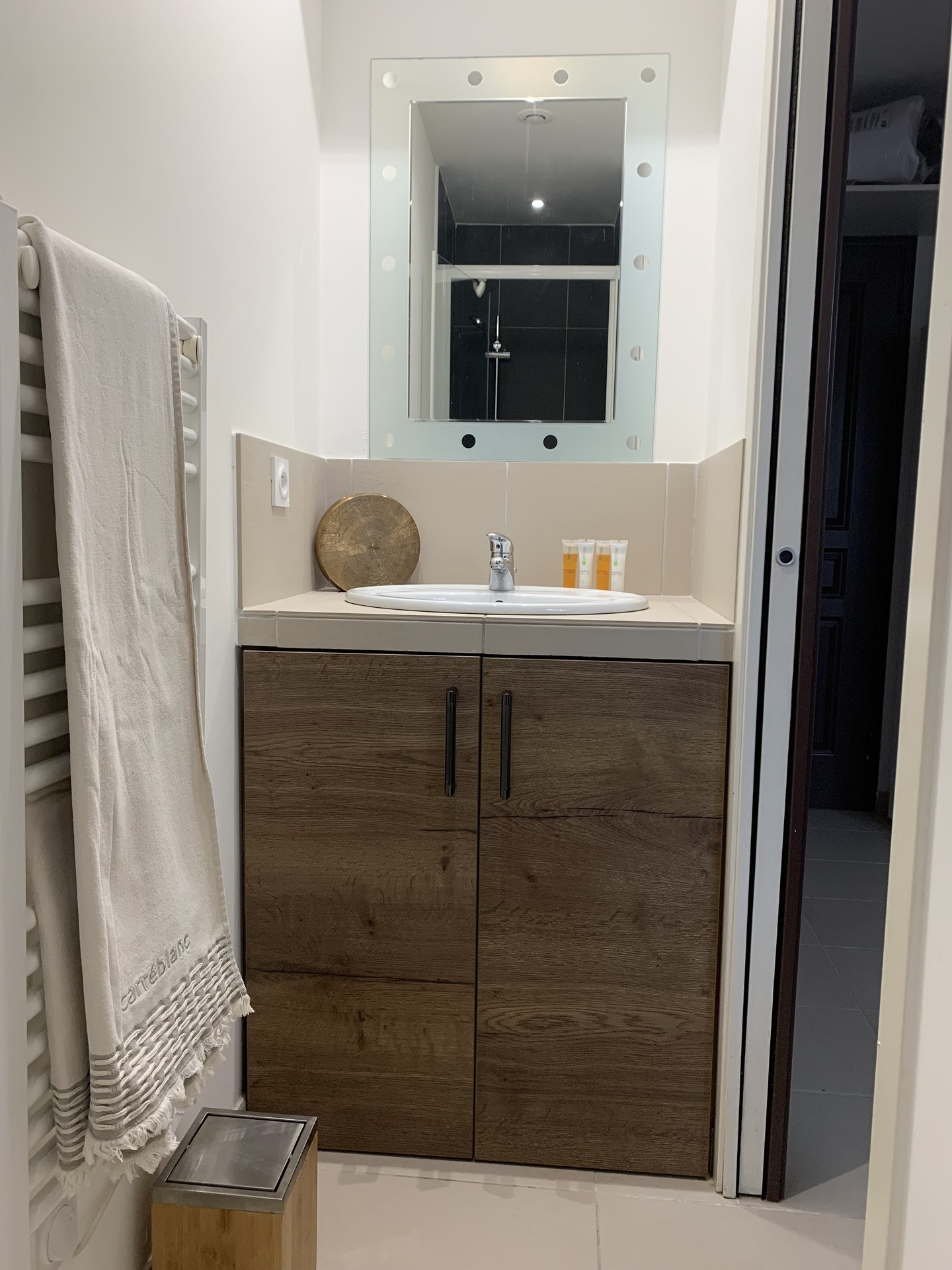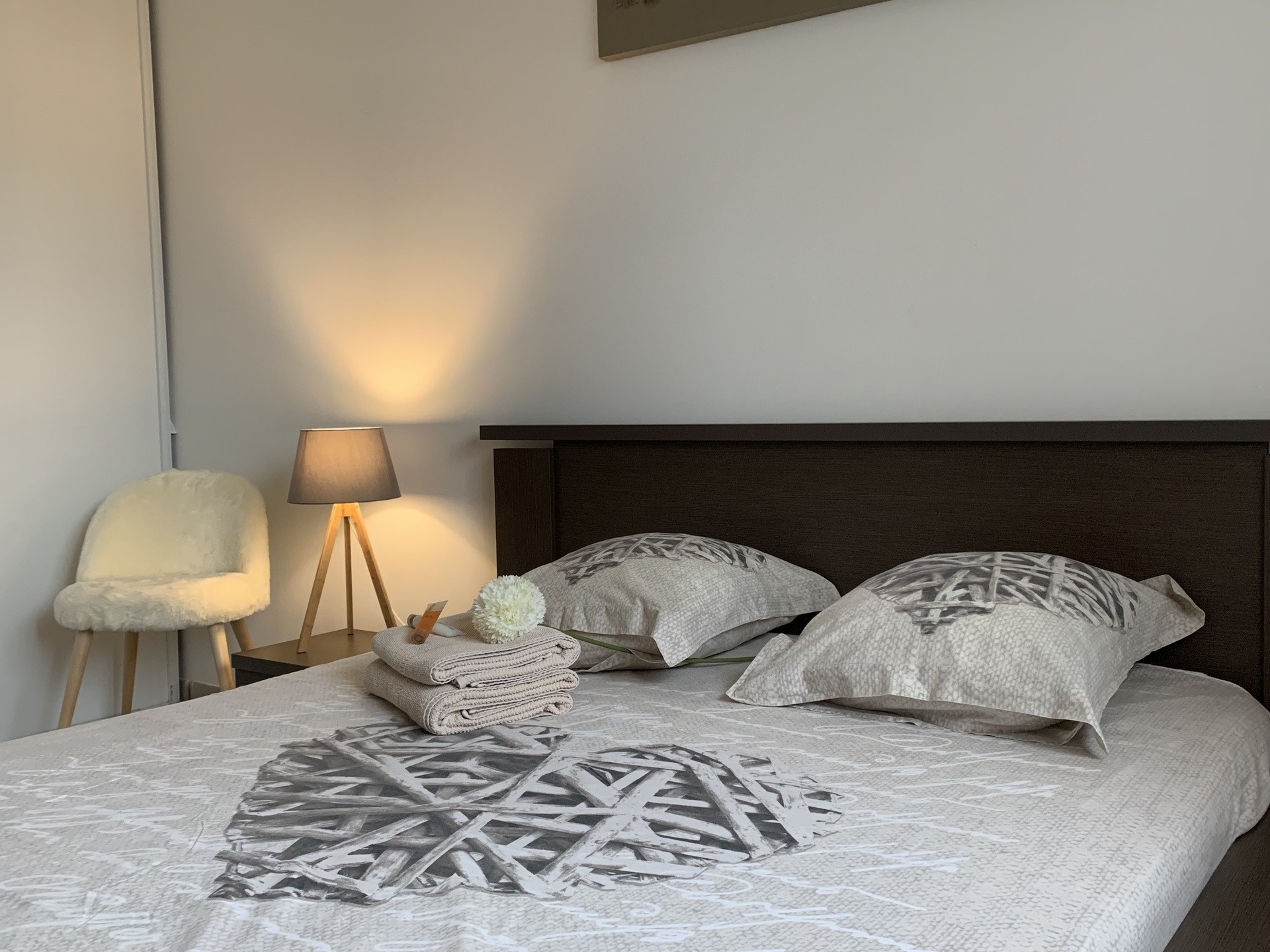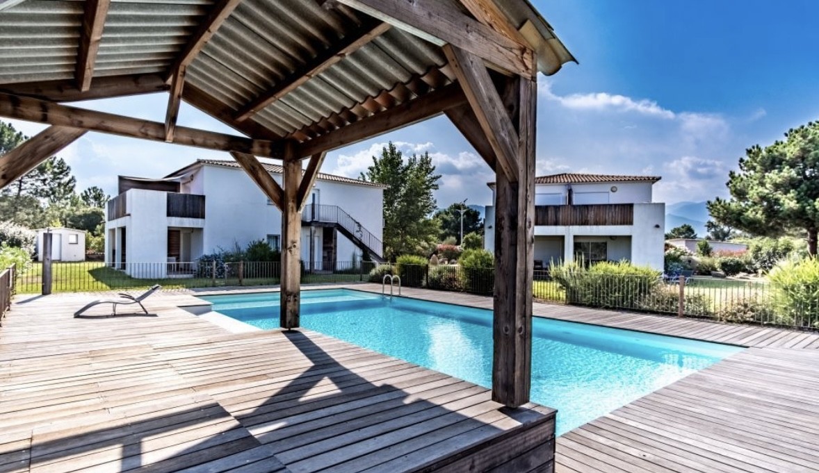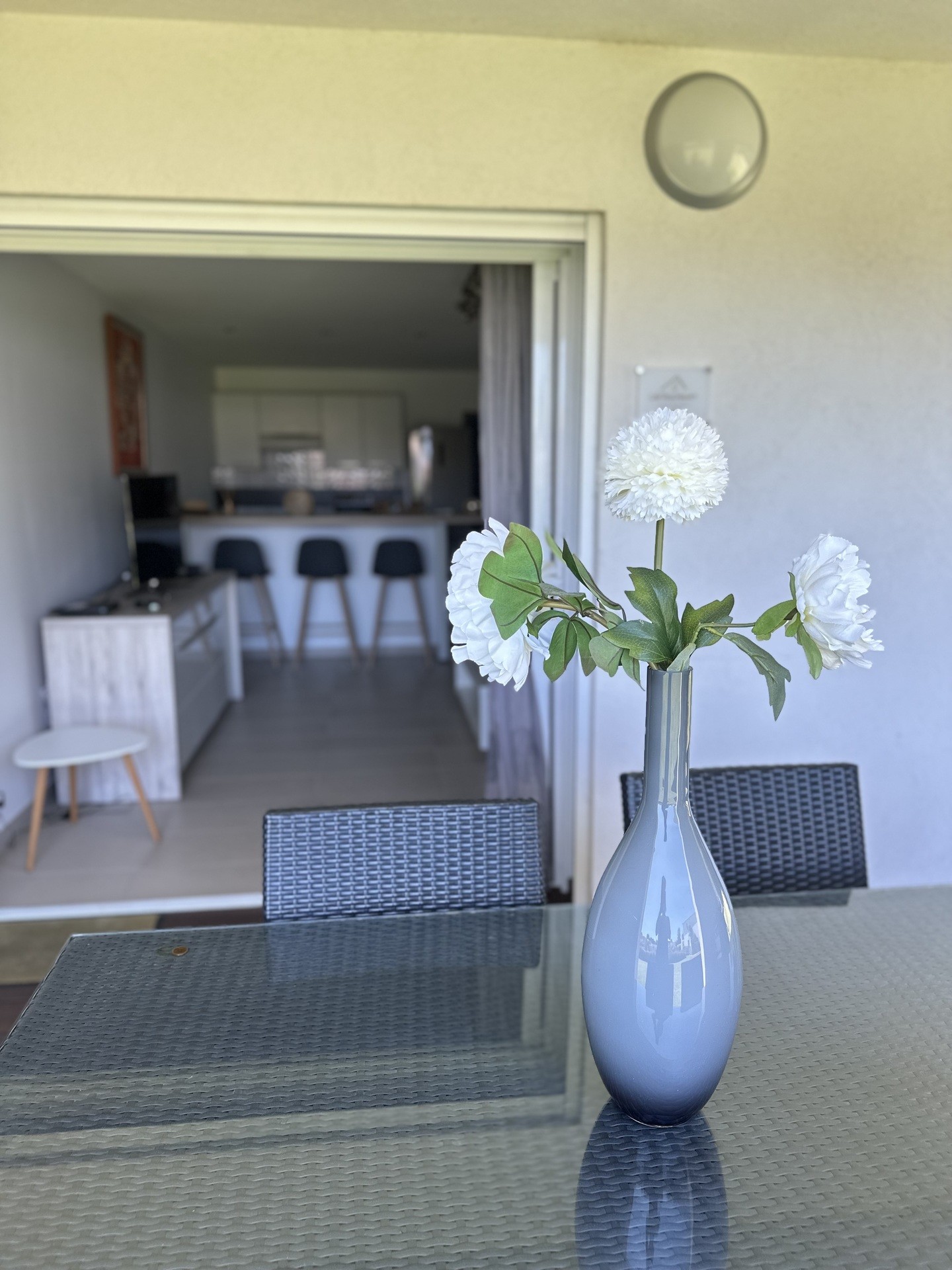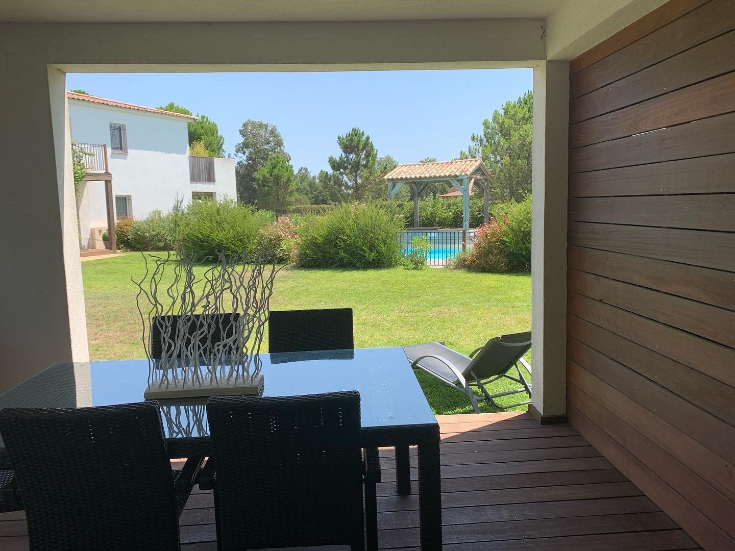 Location saisonnière. Appartement climatisé situé en rez de jardin dans une résidence de standing. Type 2 de 47m2, pour 4 personnes, entièrement équipé à neuf. 1 chambre avec salle de bain. WC séparé. Pièce à vivre avec cuisine américaine ouverte sur une terrasse de 15m2 couverte en face de la piscine.