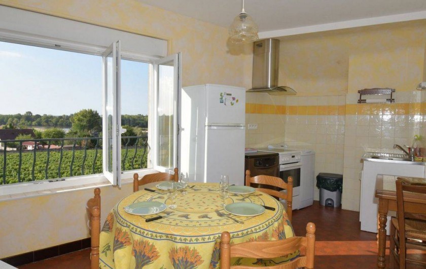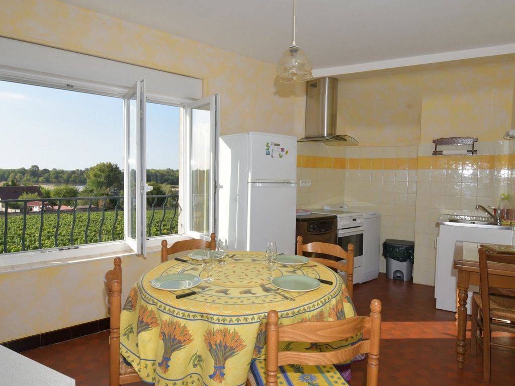à louer appartement 1er étage pour 2 adultes et deux enfants ou 4 adultes, + 1 bébé, récemment refait à neuf avec une superbe vue sur la Loire et les vignes, comprenant 1 cuisine équipée d'un réfrigérateur-congélateur, 1 cuisinière avec four et plaque à induction, 1 lave linge, 1 lave vaisselle. 1 four micro onde. 1 chambre avec lit 140, 1 chambre enfants avec 2 lits gigognes de 90 pouvant être transformé en un grand lit+ 1 lit parapluie bébé, 1 salle de bain- WC . 1 salle à manger salon avec canapé fixe, télé écran plat, chaine hifi, wifi illimité. Maison située au