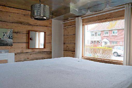 La chambre est orientée face mer et dispose d'un lit plateforme suspendu orienté face à un grand vitrage.