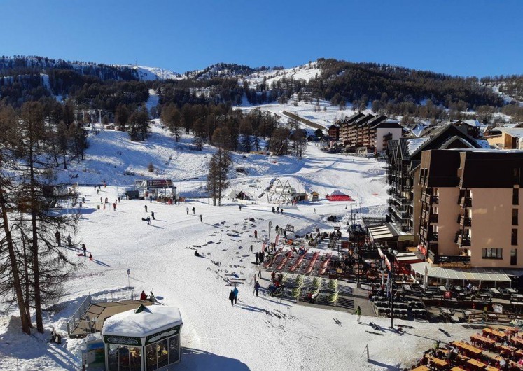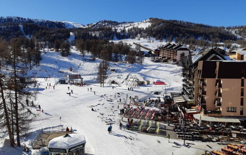 Balcon exposition Sud avec une superbe vue dégagée sur le domaine skiable.
