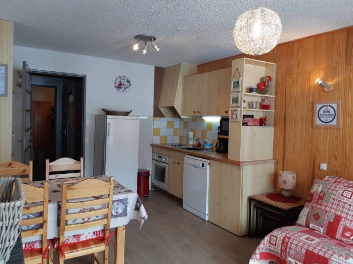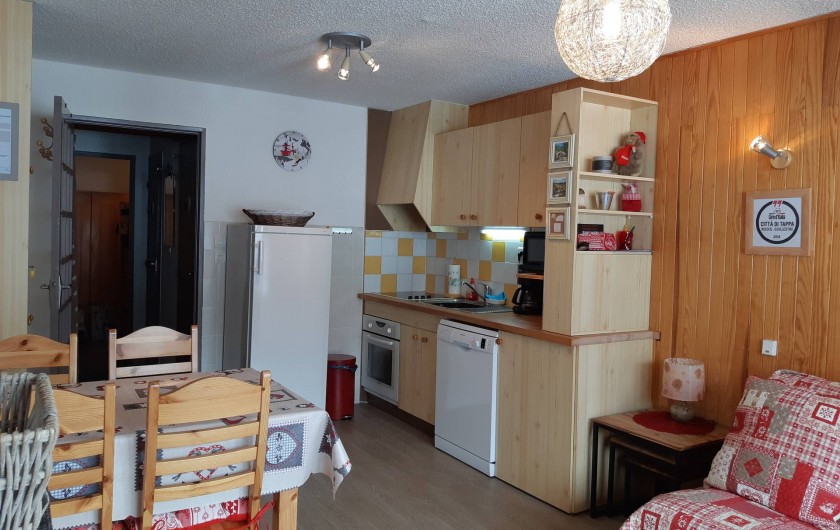 Grande pièce à vivre avec coin cuisine, salle d'eau avec baignoire et WC indépendant.