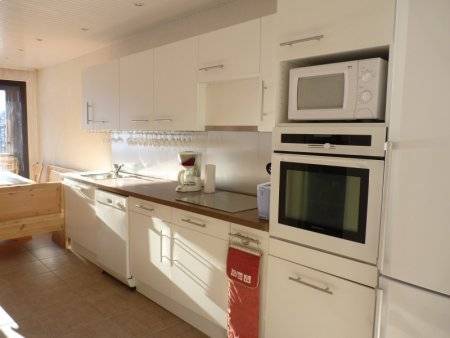 Un grand réfrigérateur/congélateur, plaques à induction, un lave vaisselle, un four, un micro ondes, une cafetière électrique, un appareil à raclette/crêpière, un grille pain, un aspirateur, une téléviseur écran plat