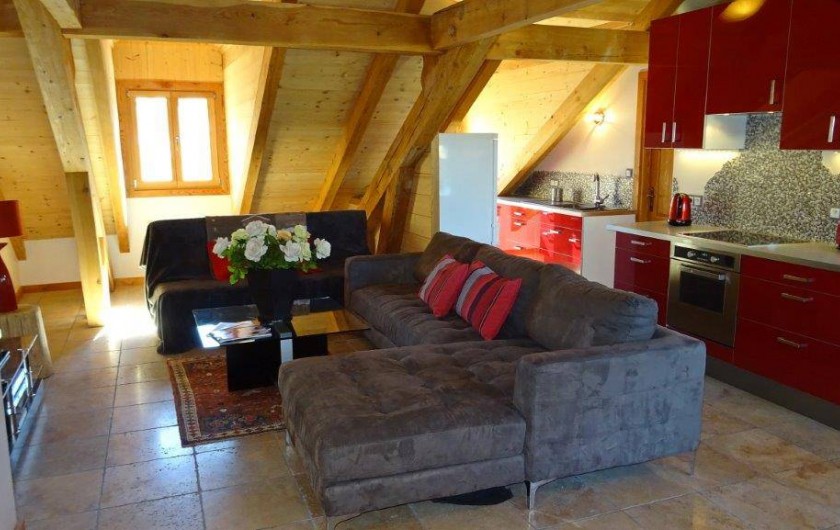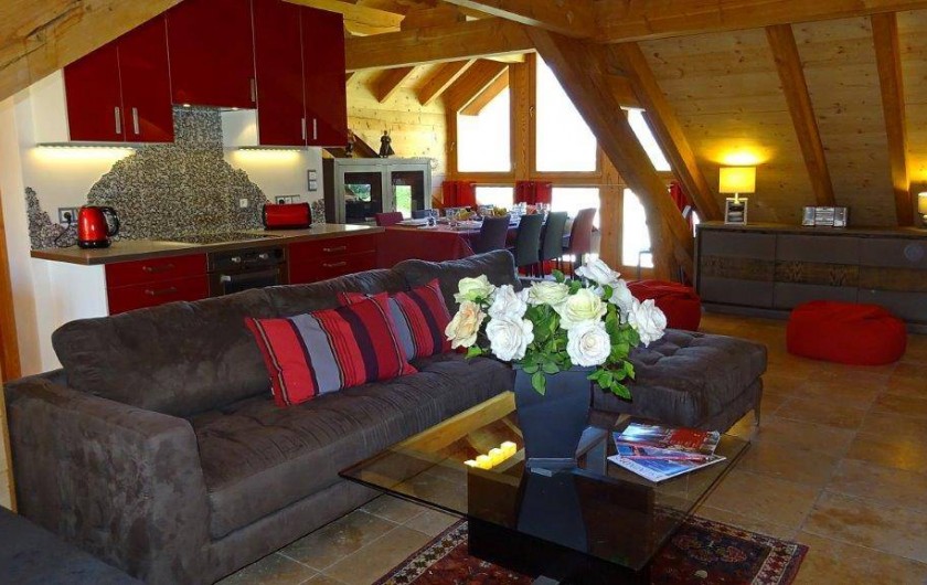 De l'espace. Une grande pièce de vie avec son coin cuisine, son coin repas avec une table à rallonge pour 8 à 10 couverts, son coin salon avec