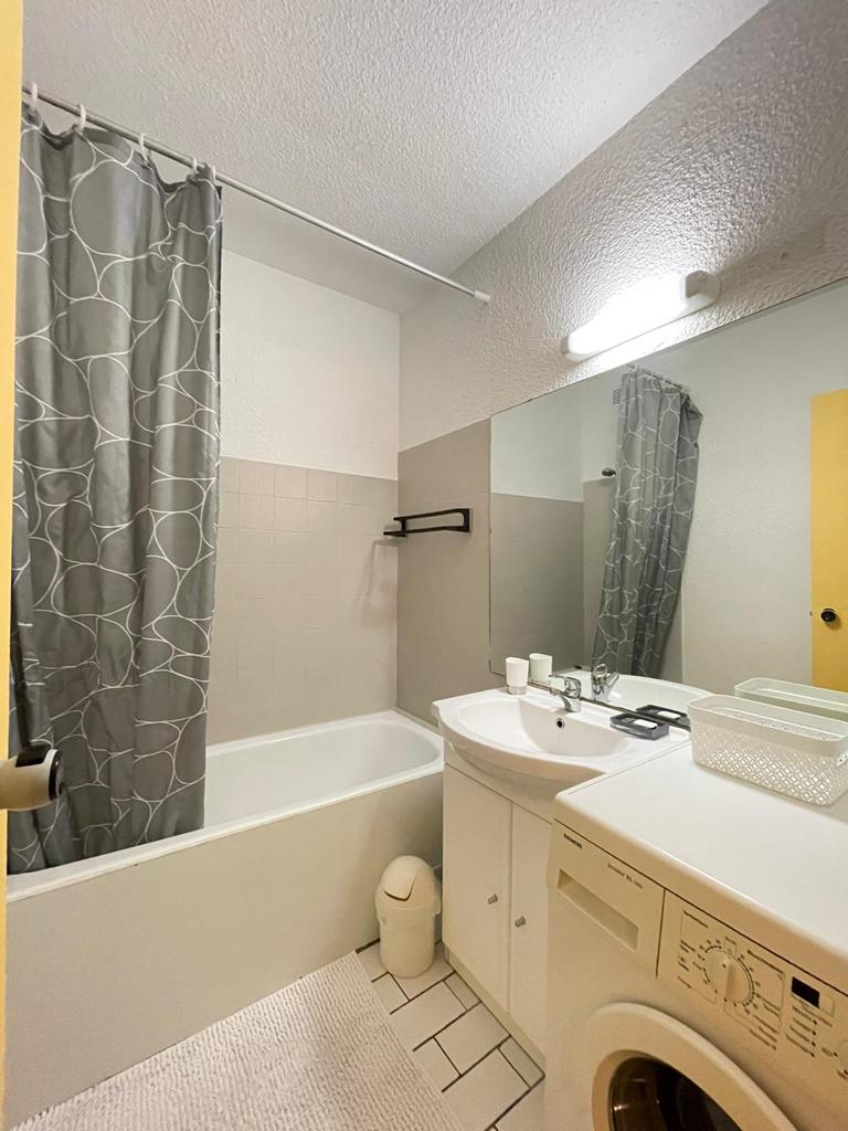 L’appartement comprend une chambre avec un lit double, une salle de bain avec baignoire et machine à laver le linge. Un