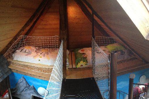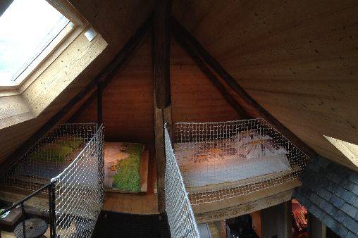 - Les deux mezzanines : reliées par une passerelle, elles sont accessibles par un escalier en colimaçon. Une dispose de deux lits simples et l’autre de deux lits doubles. Ce sont des espaces de couchage, disposant de peu de place autour des lits.