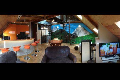 La décoration vous donnera une ambiance extérieure grâce à sa fresque, sa table de jardin, un escalier et une passerelle en fer donnant accès aux mezzanines.