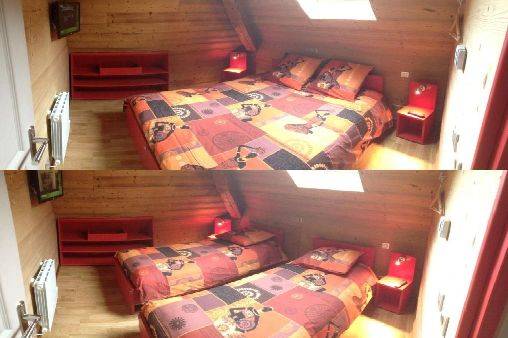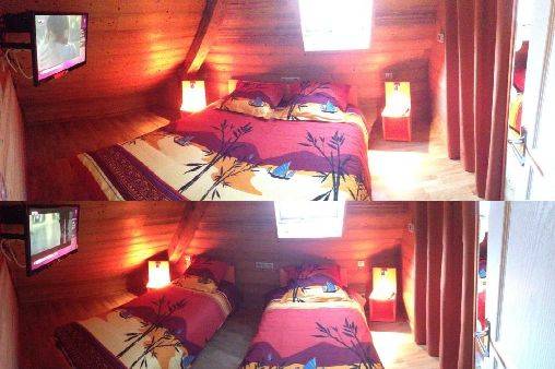 - Les trois chambres mansardées : Elles ont un thème de couleur, avec les parures de lits assortie. Les lits ont été fabriqués pour être proposés en version double ou single. Leur conception permet de les réunir parfaitement et de ne pas avoir de vide entre les matelas, configuration à préciser lors de la réservation. La literie est de grande qualité. Les trois chambres sont équipées de TV et radio.